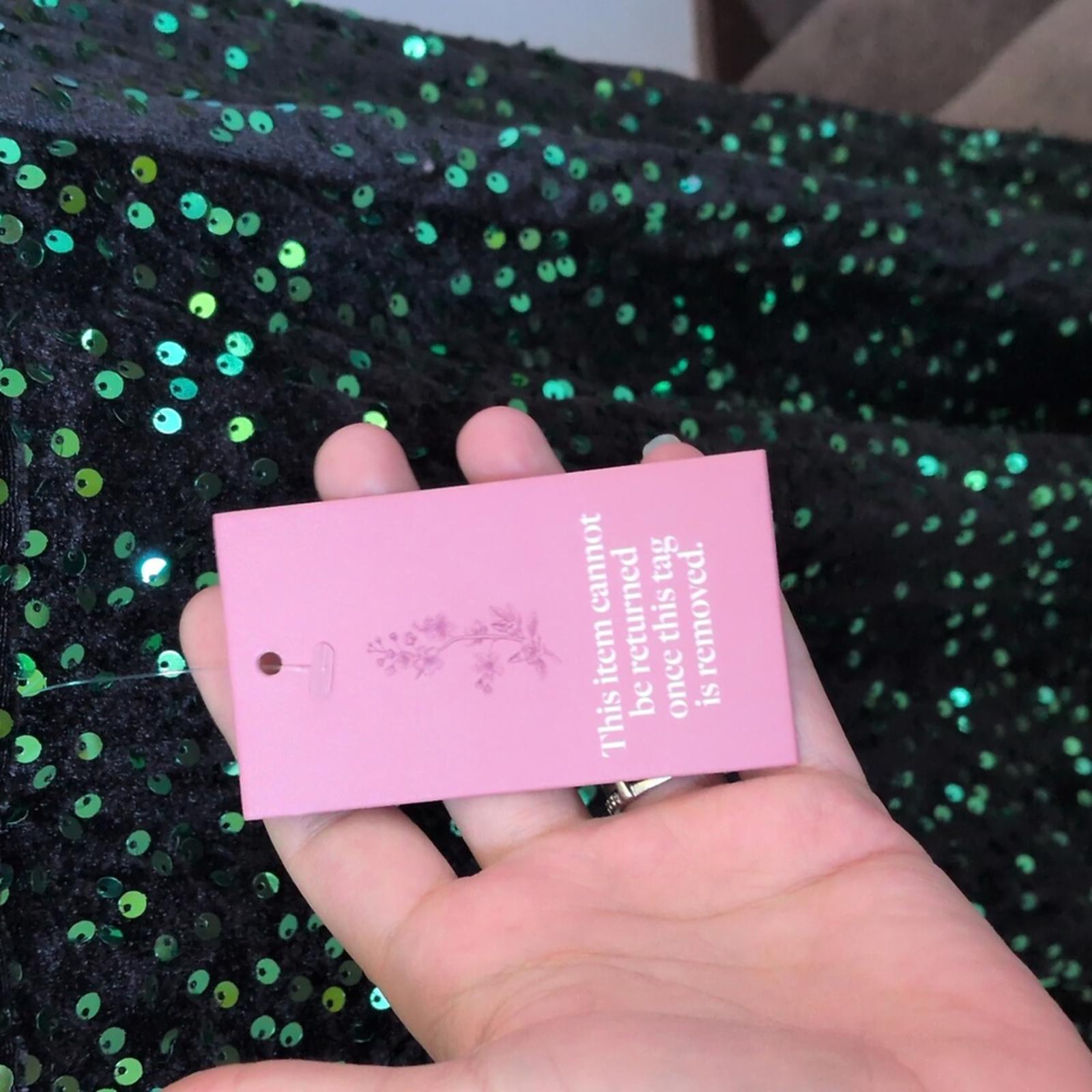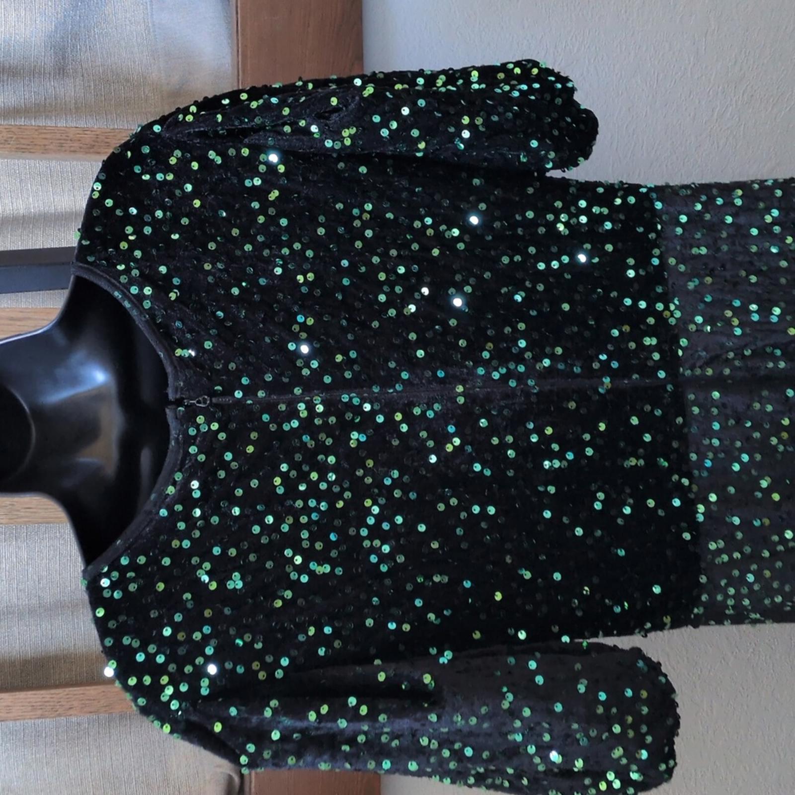 Black Velvet with green sparkles overlaid on top. New with tags. Puff sleeves. zipper in the back.