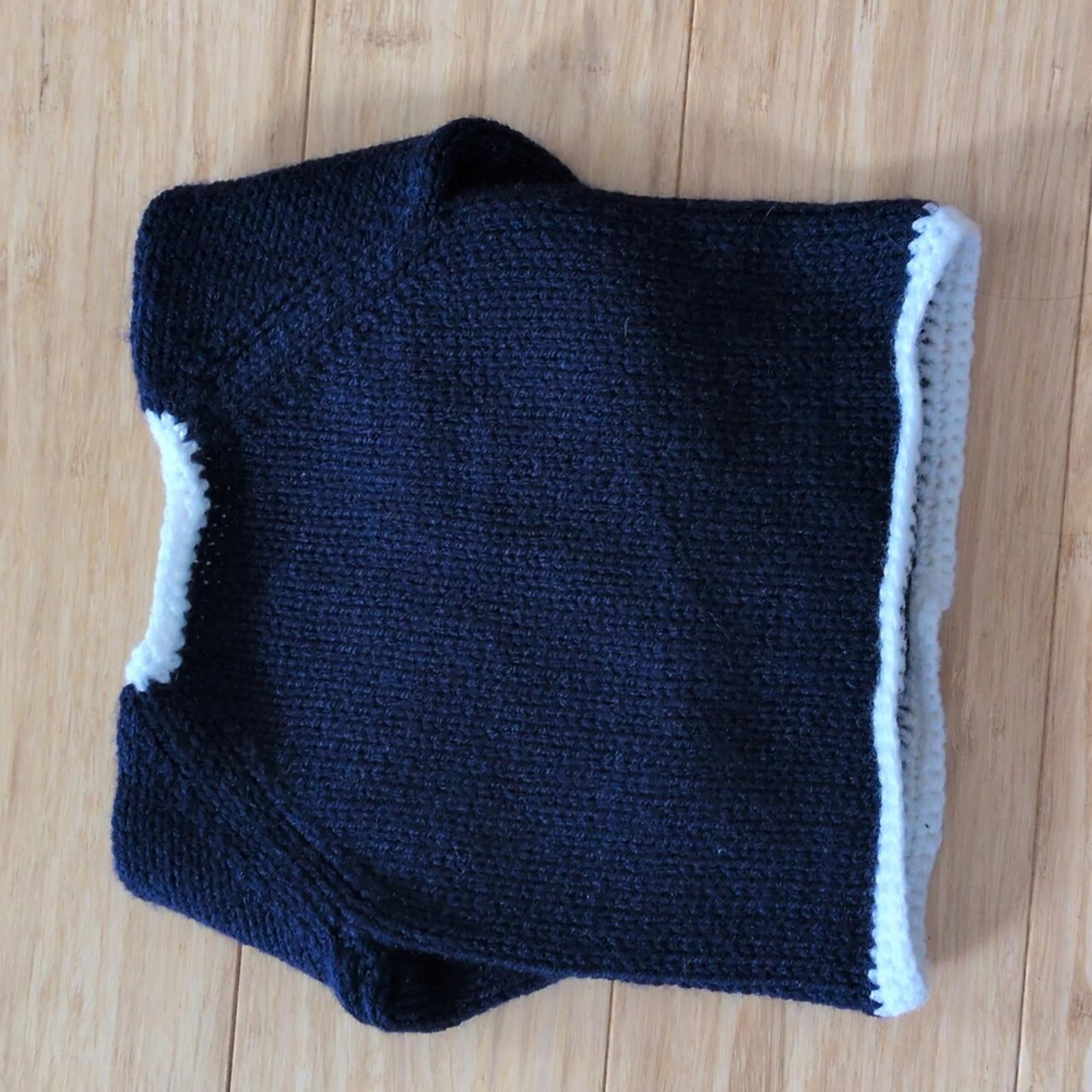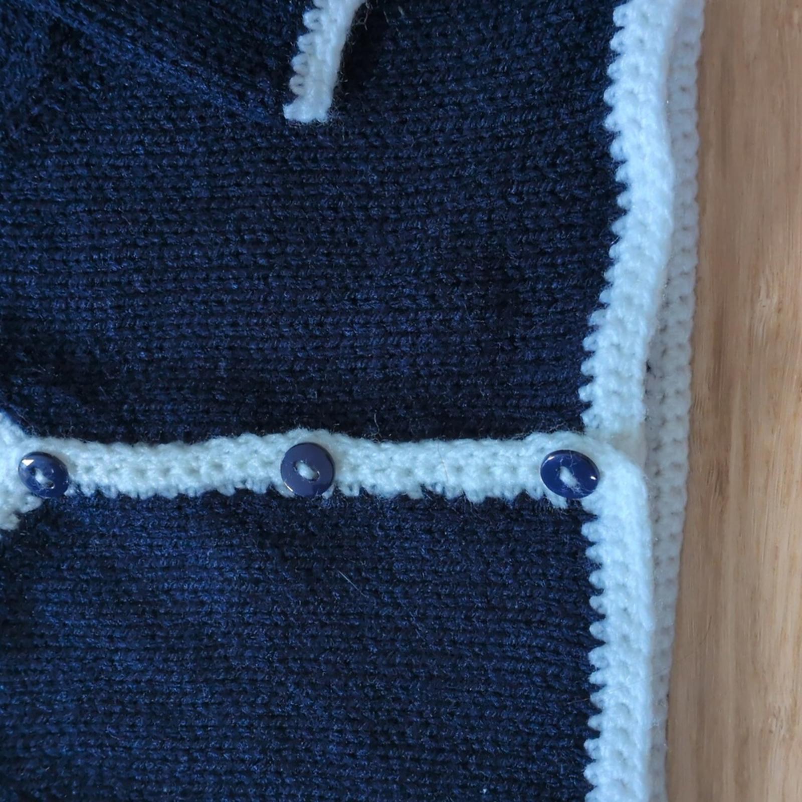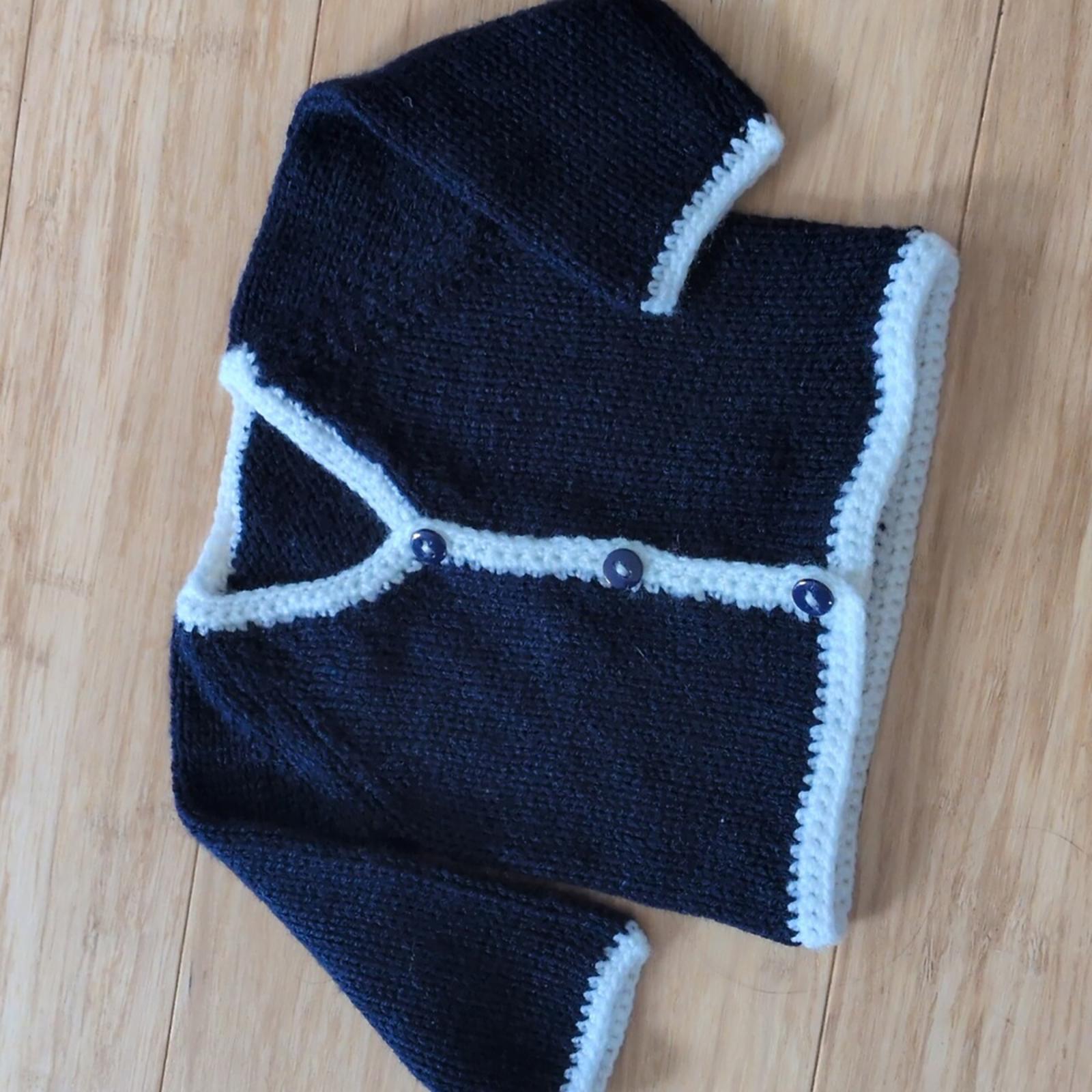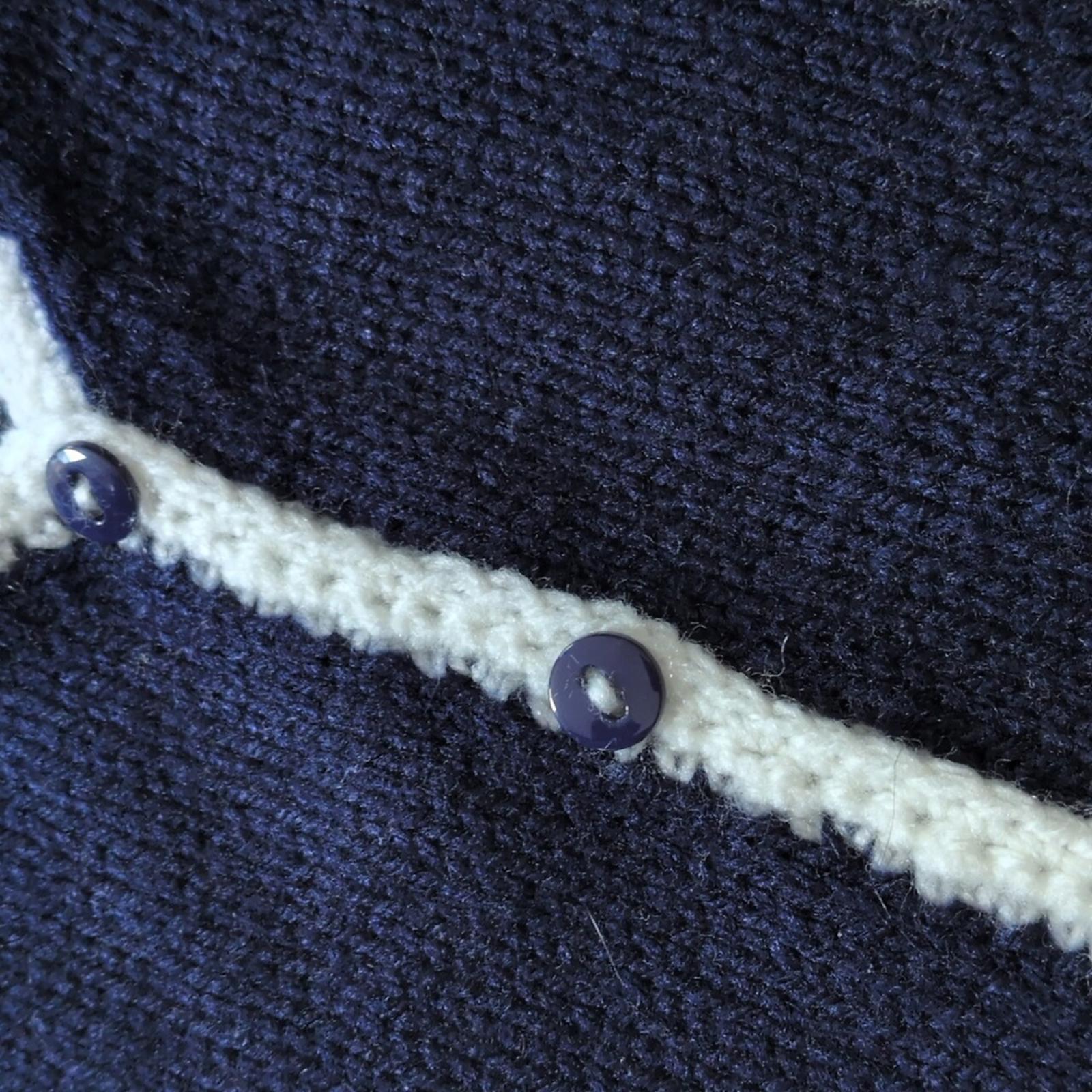 Hand Knit Newborn Sweater. Navy blue with white detailing. buttons down the front.