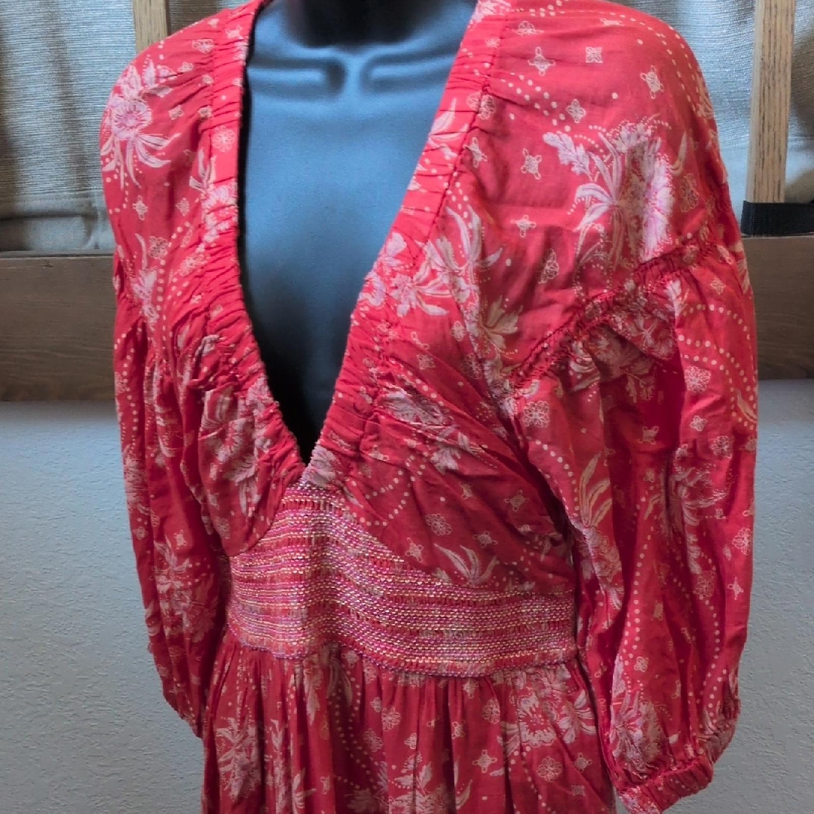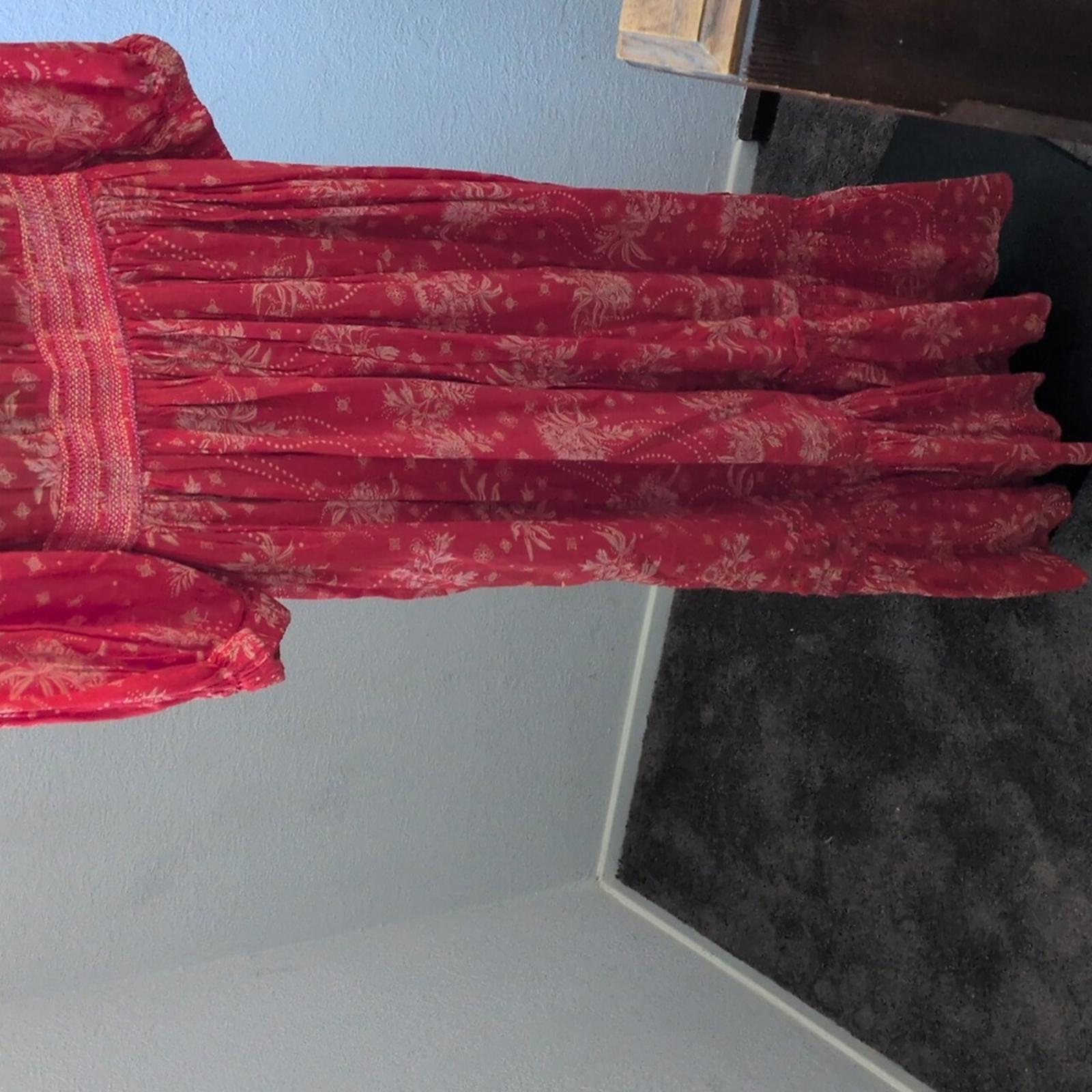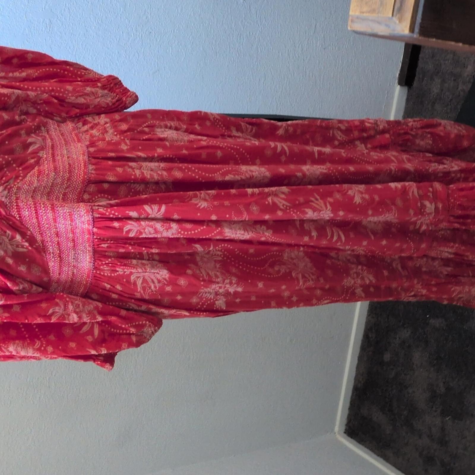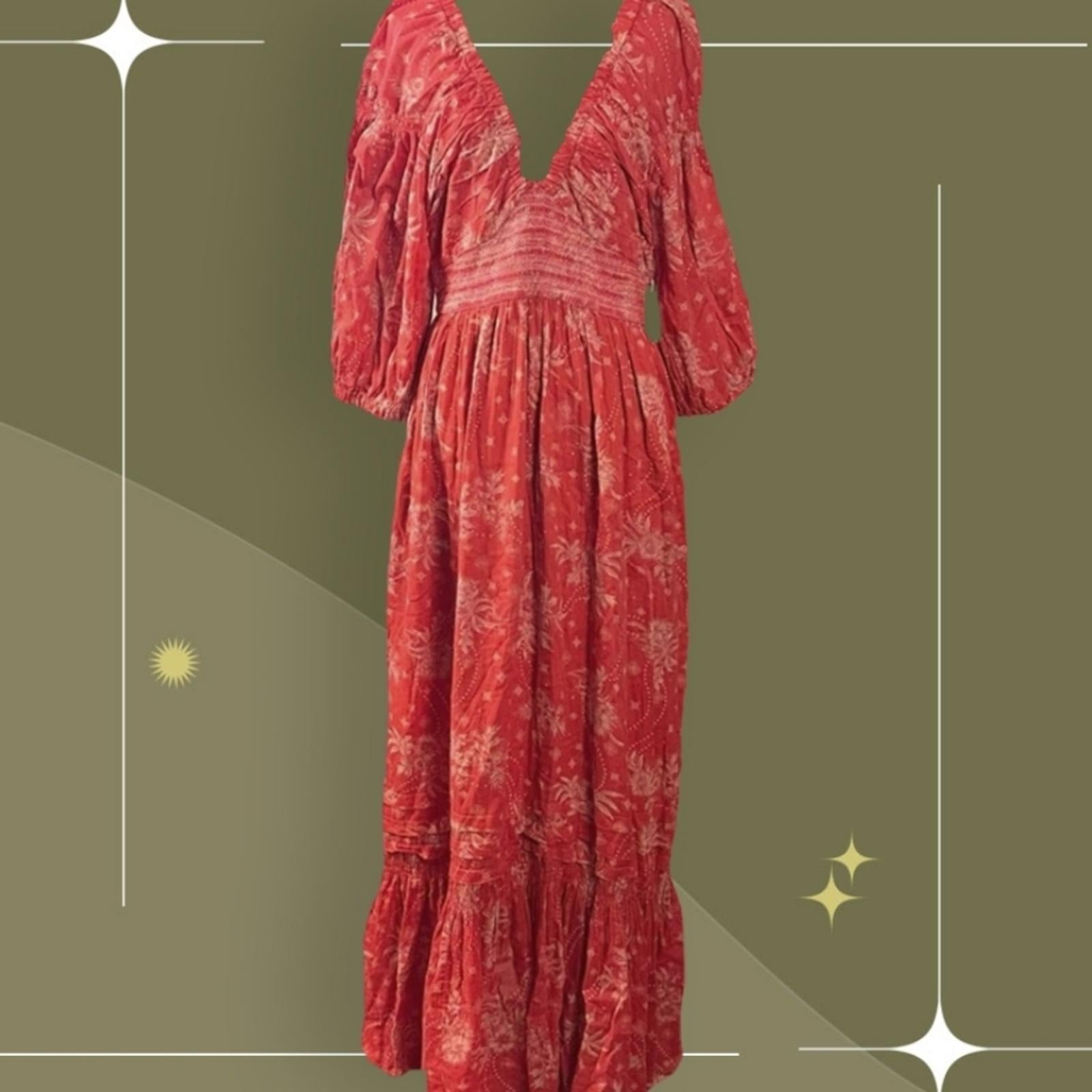 Golden Hour Maxi Dress In Cayenne And Pink Size S. fits true to size. v-neck. elastic waist. elastic at the ends of the sleeves. has pockets on the sides.
