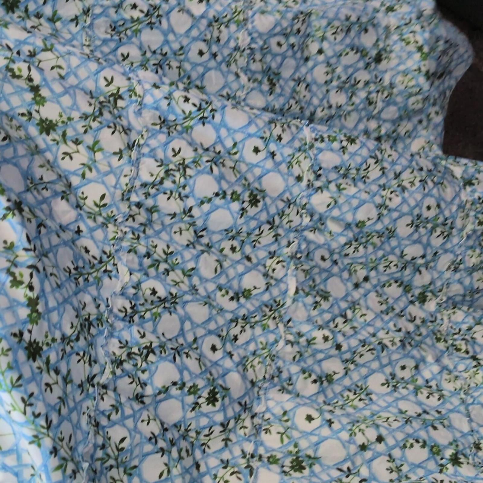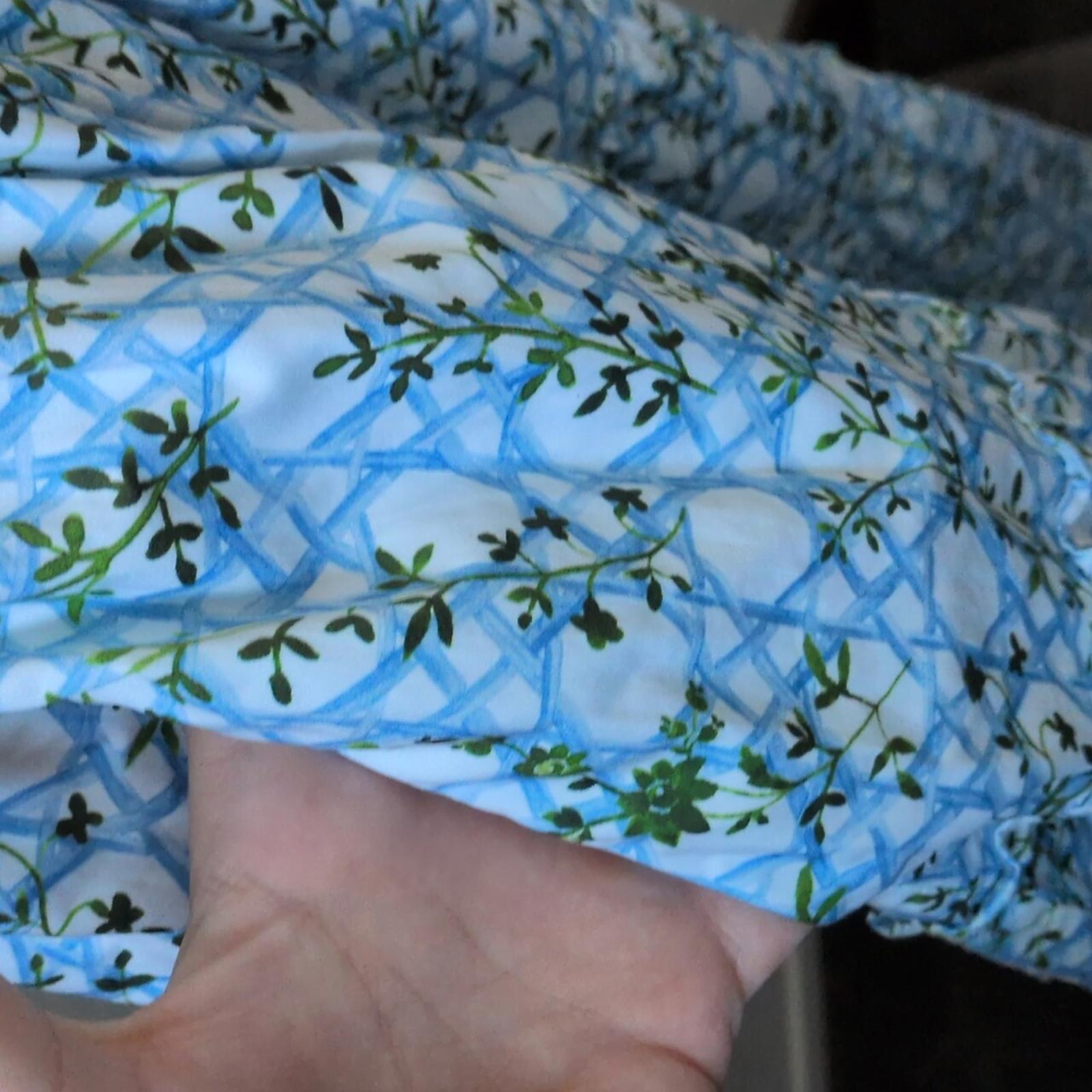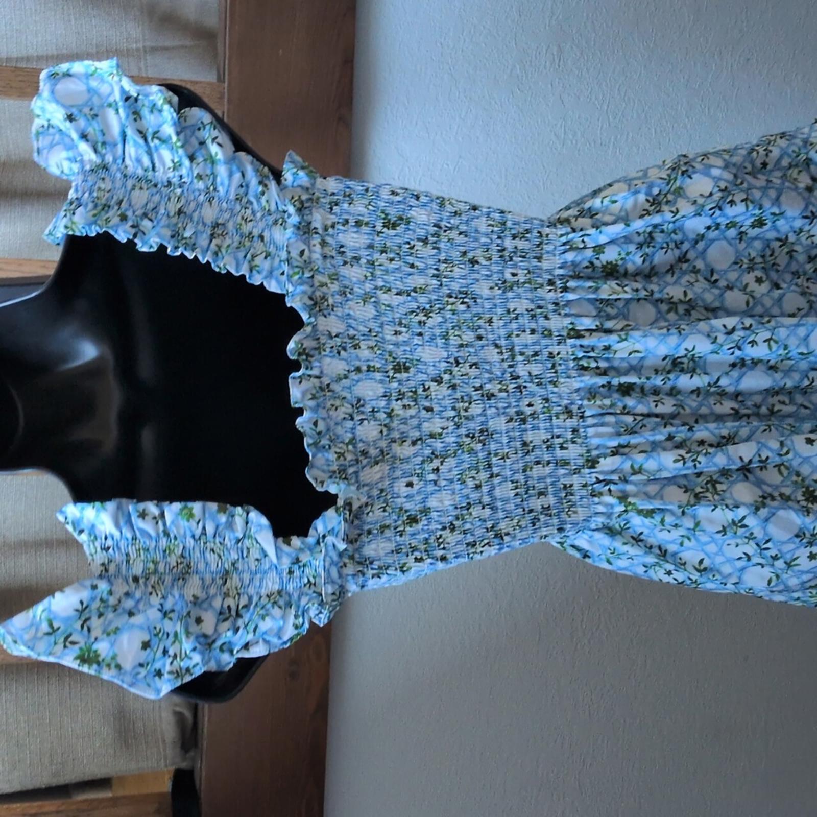 white floral against a blue trellis pattern. elastic bodice. elastic flutter sleeves. pockets on both sides.