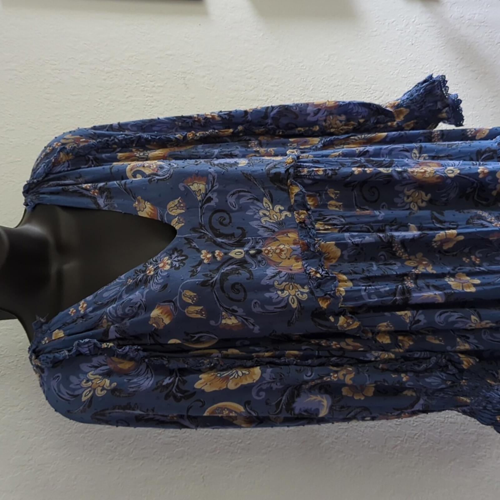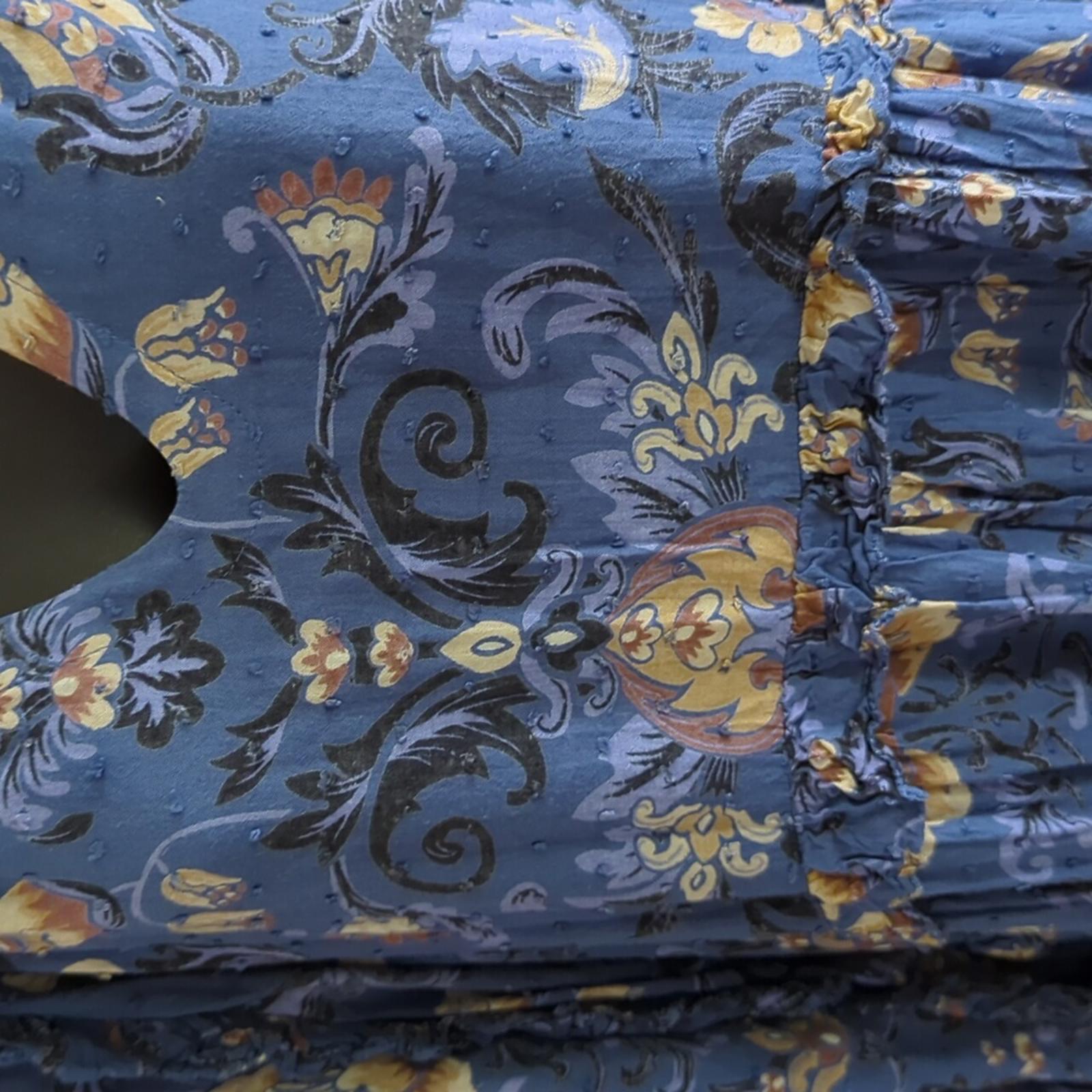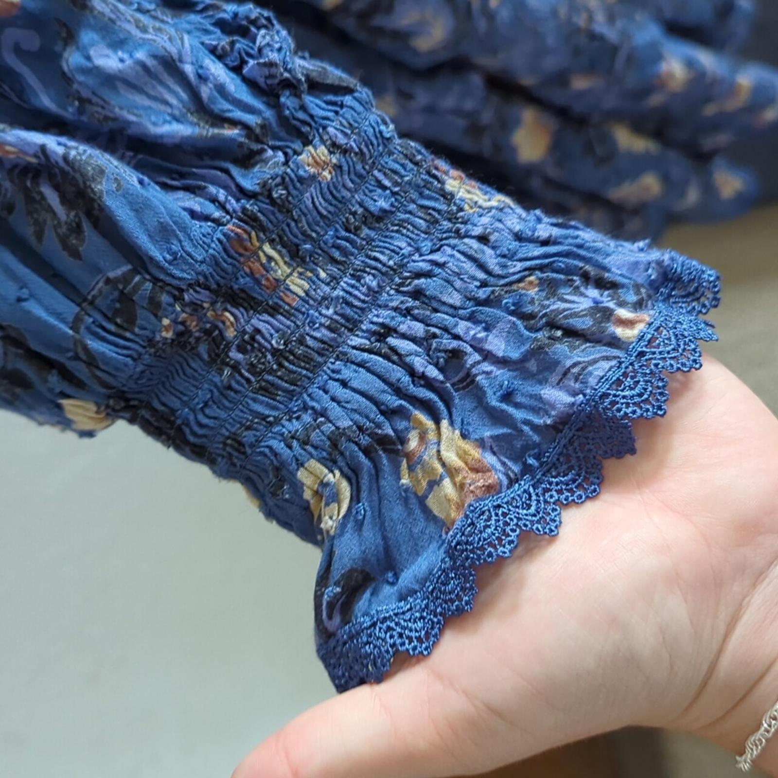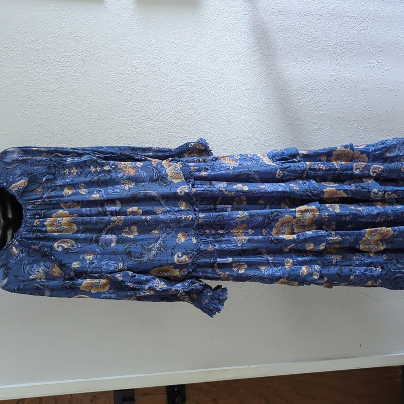 Spell and the Gypsy blue floral midi dress. Aurora style. has long sleeves with lace cuffs. pretty tiered design in the Hem and in the bodice. Some intentionally frayed ruffles throughout. v-neck in the front. fits slightly oversized in my opinion. would recommend for more of a size medium than a small.