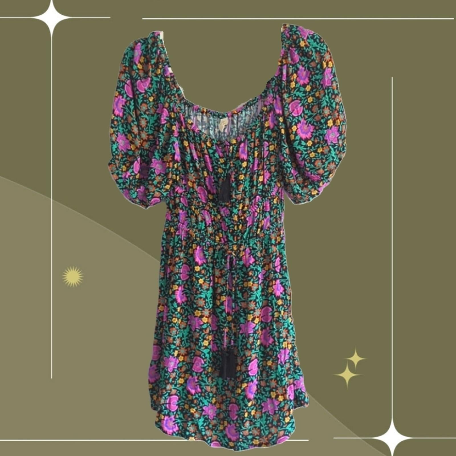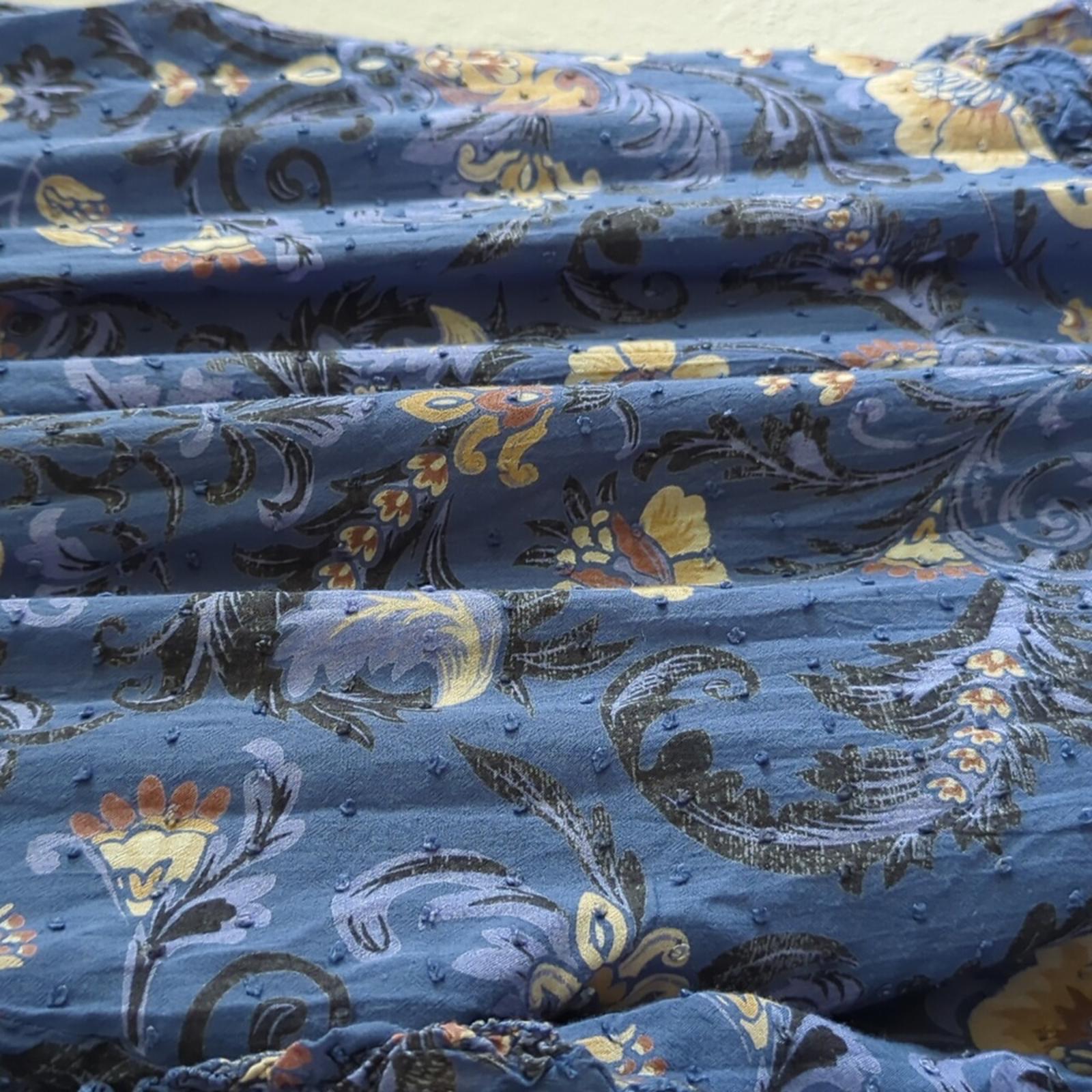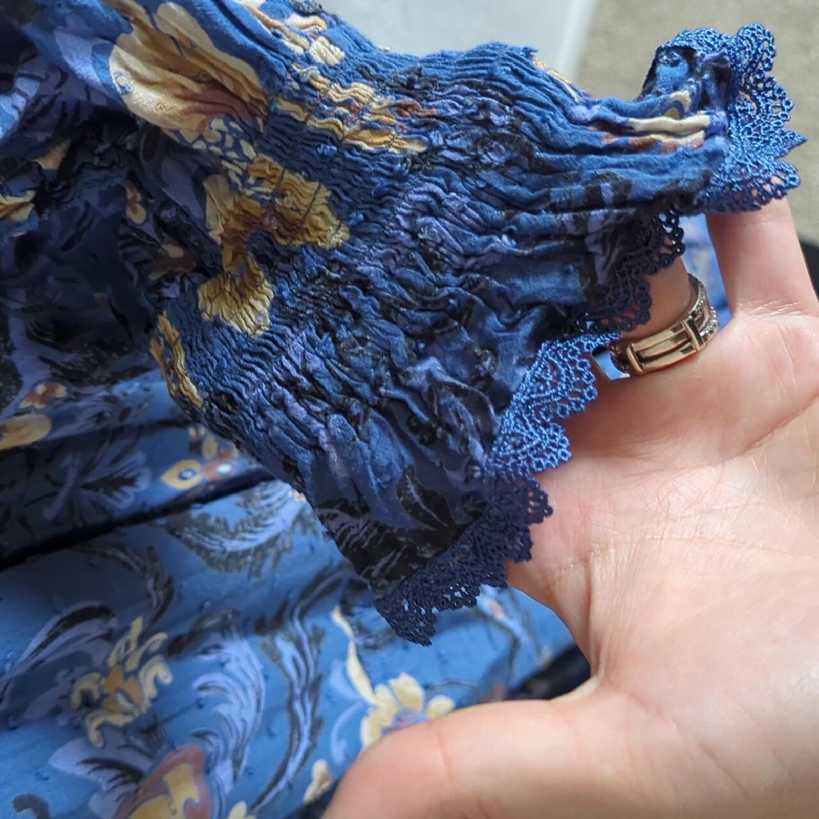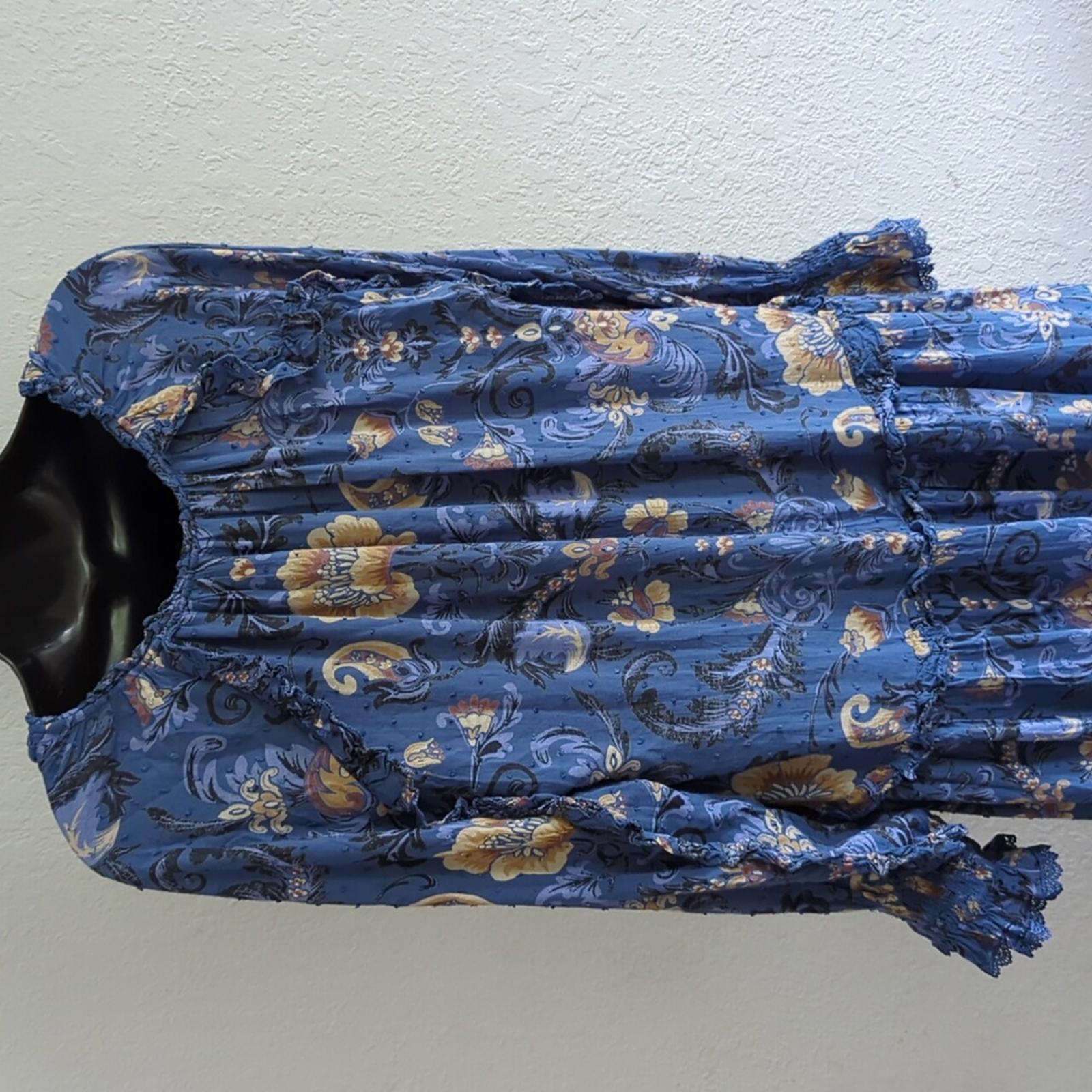 Spell and the Gypsy blue floral midi dress. Aurora style. has long sleeves with lace cuffs. pretty tiered design in the Hem and in the bodice. Some intentionally frayed ruffles throughout. v-neck in the front. fits slightly oversized in my opinion. would recommend for more of a size medium than a small.