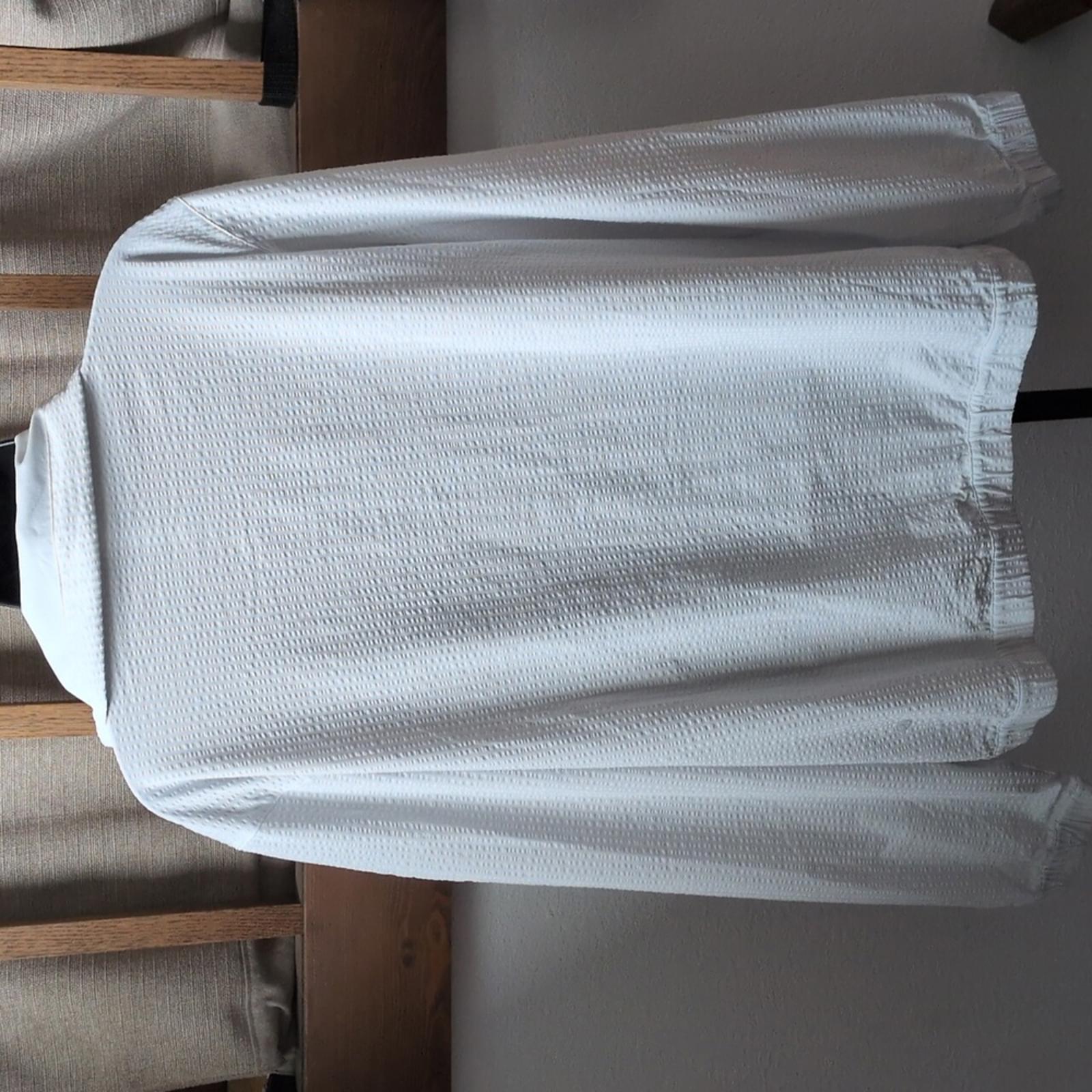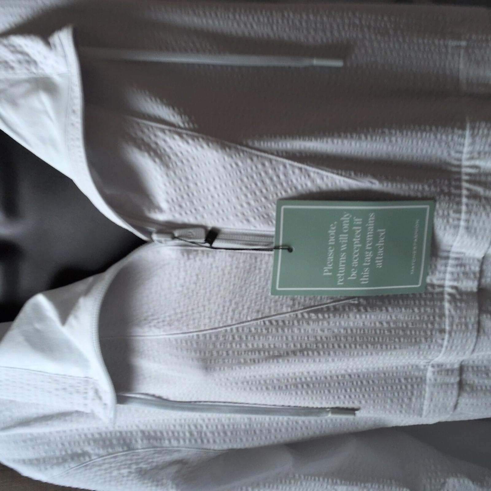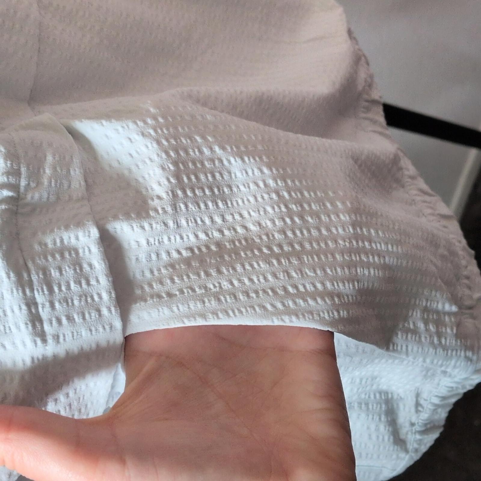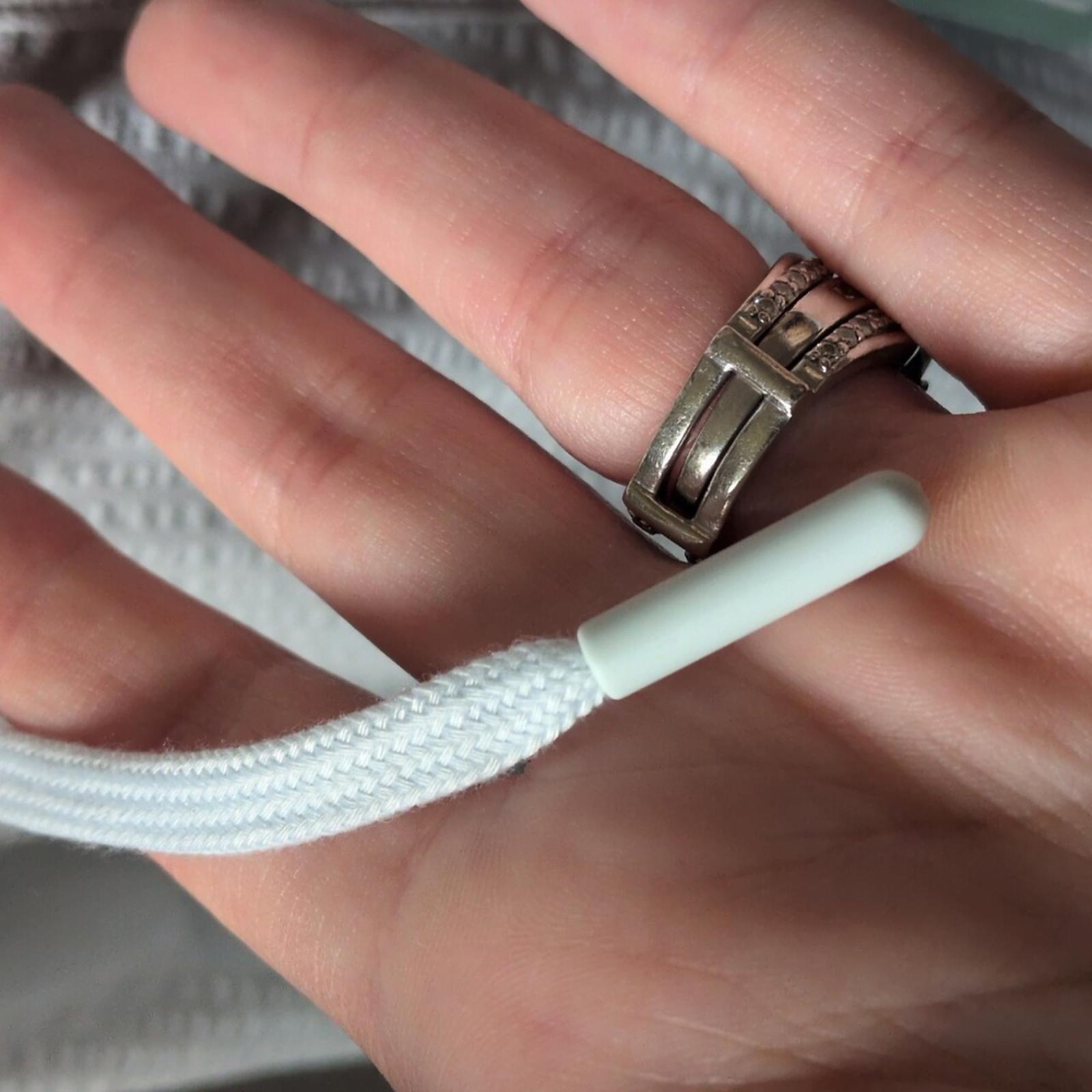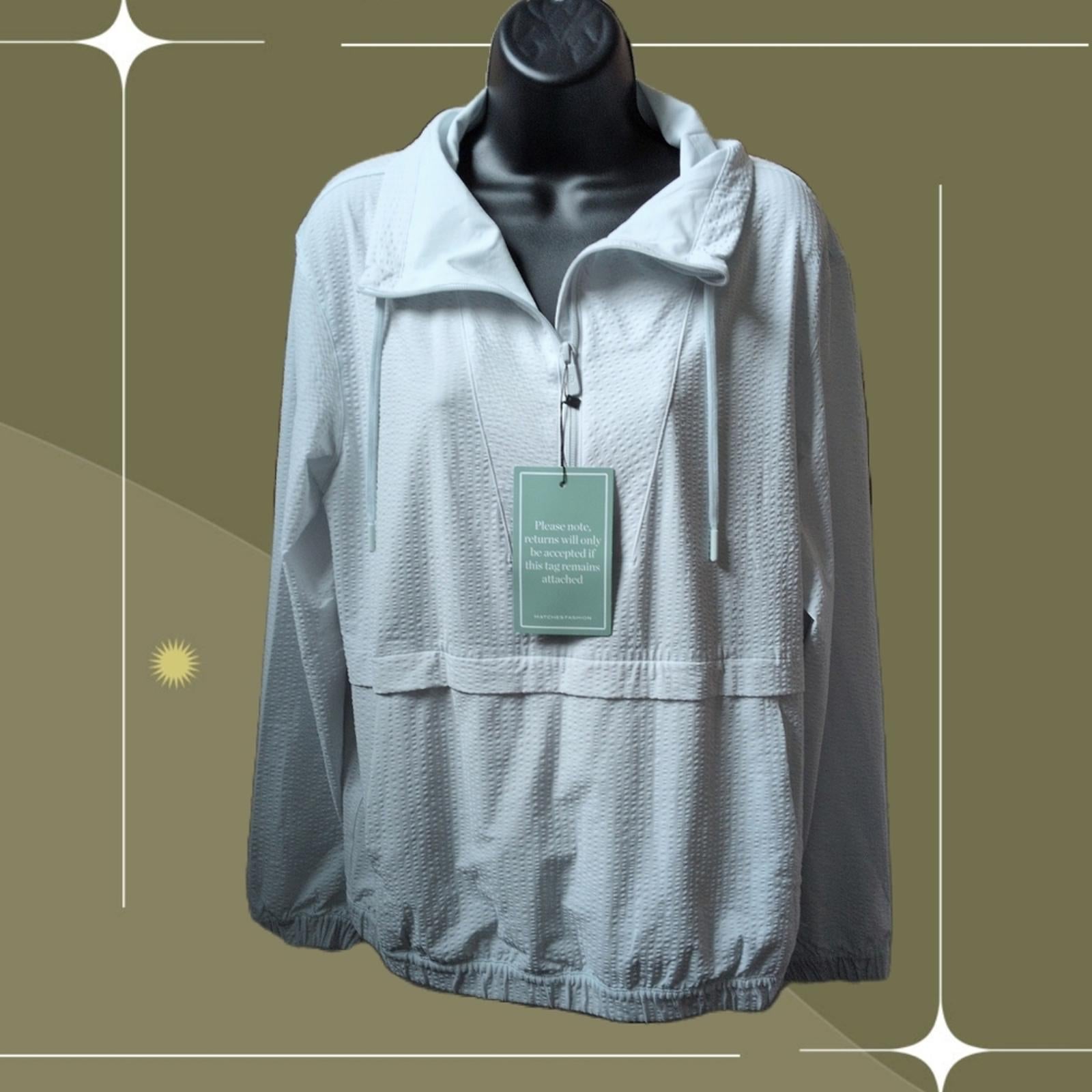light minty blue color. has kangaroo pocket. lightweight material. half zip in the front. has two ties as well on the collar.