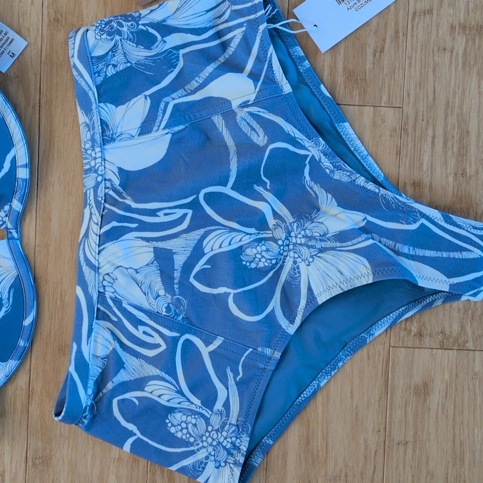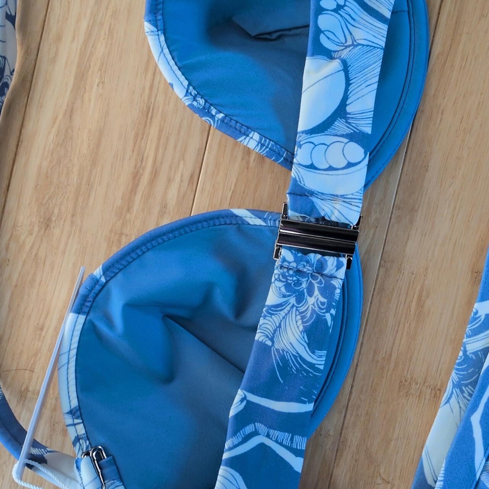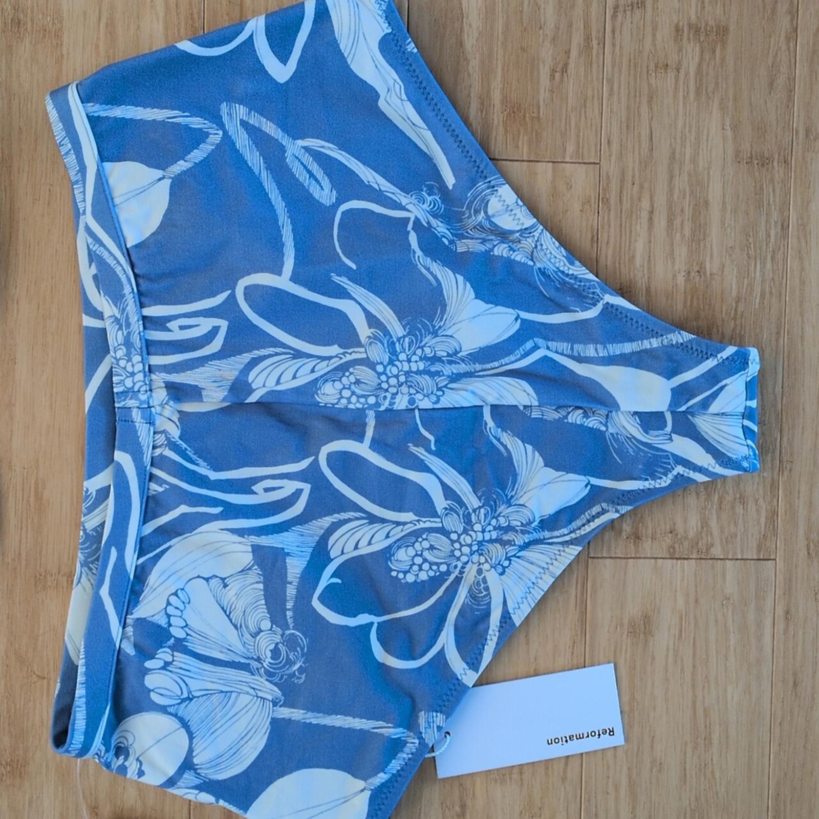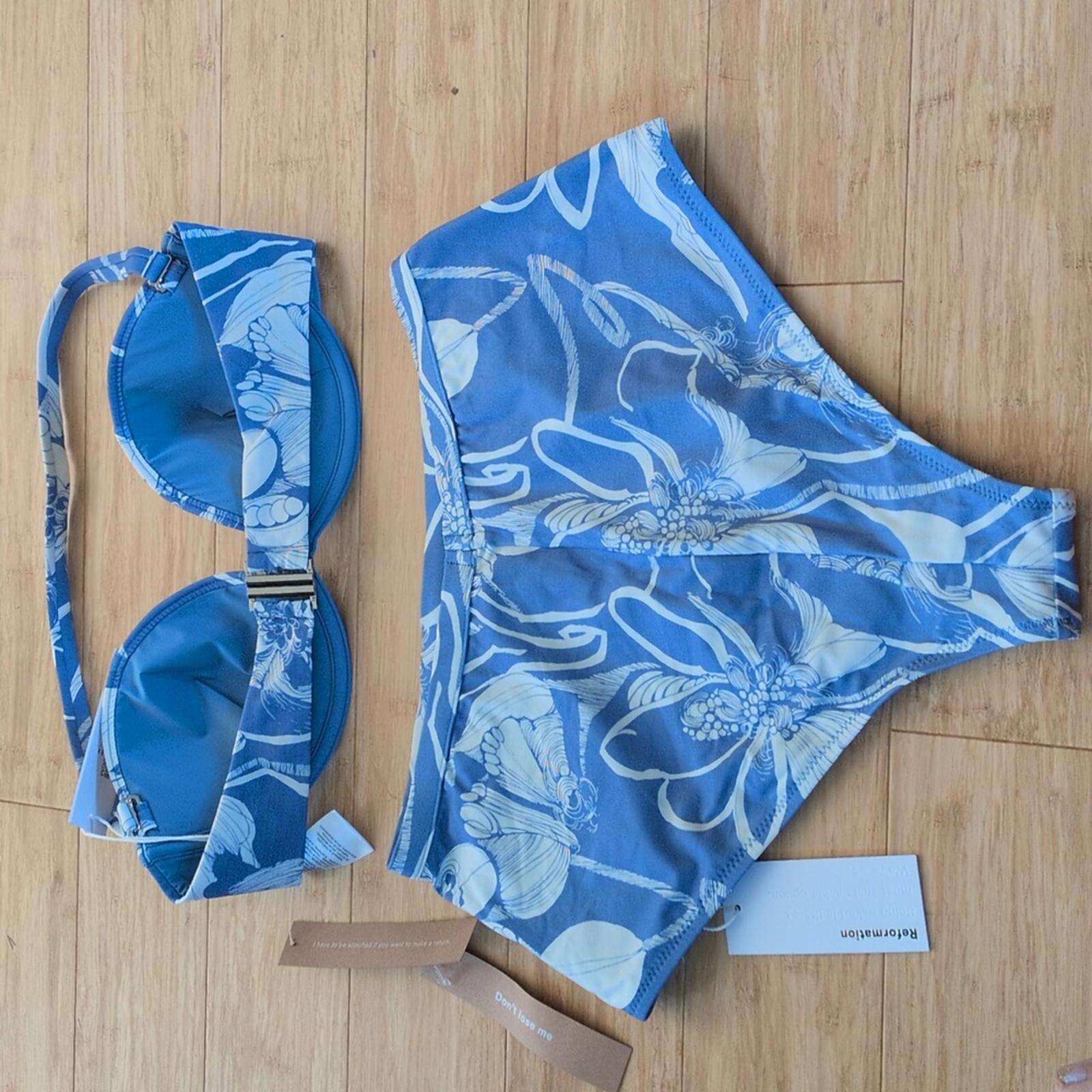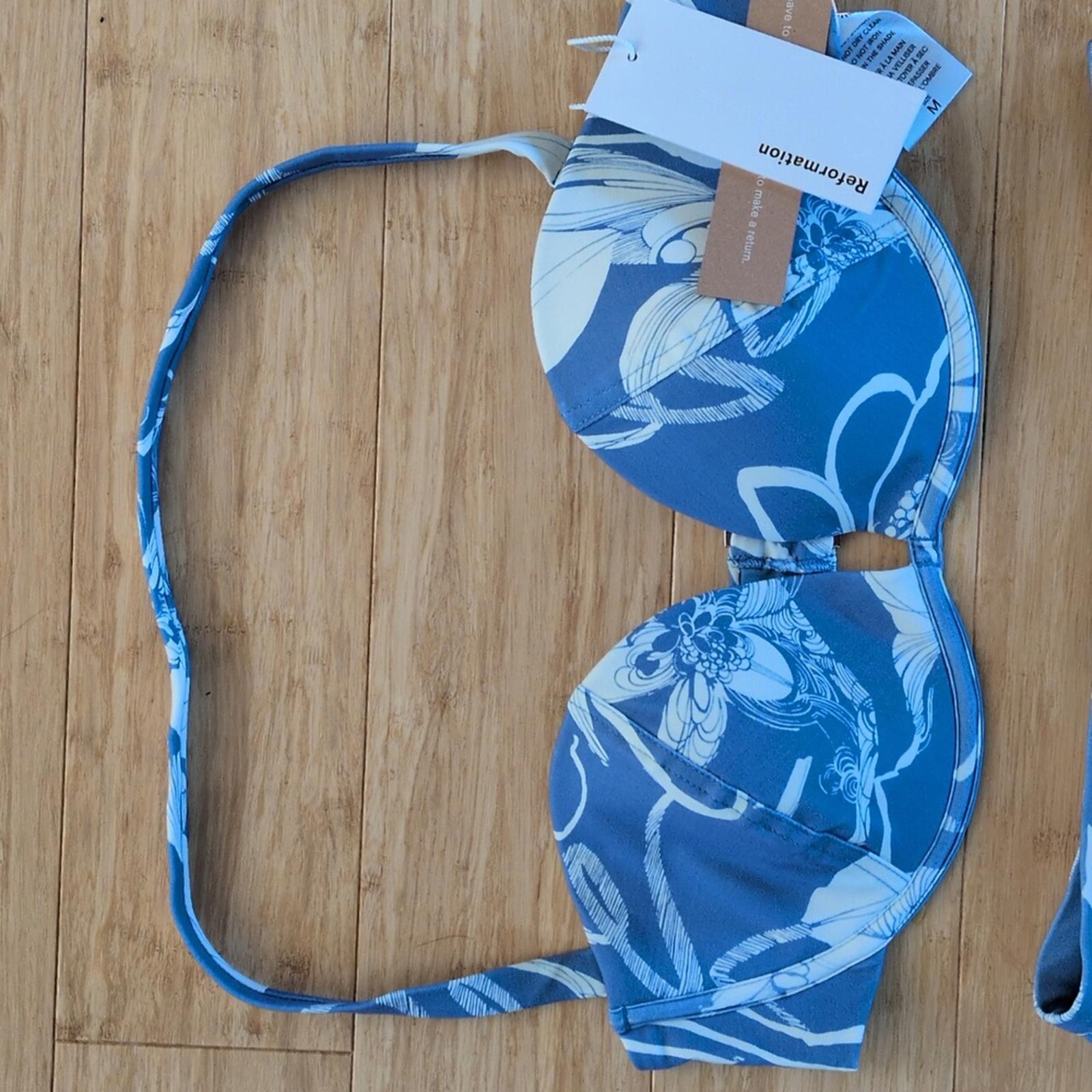 NWT Reformation Lago Bikini In Cozumel Size M.removable strap on the top of the swimsuit to make a strapless top. sanitary liner is still intact inside bottoms. is still intact inside bottoms. cheeky style bottom. high waisted.measurements: strap closed on top from side to side: 14"bottoms waist side to side: 12"bottom's middle top to bottom of crotch: 12.5"