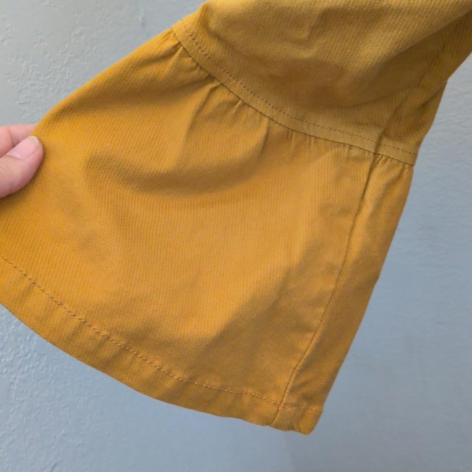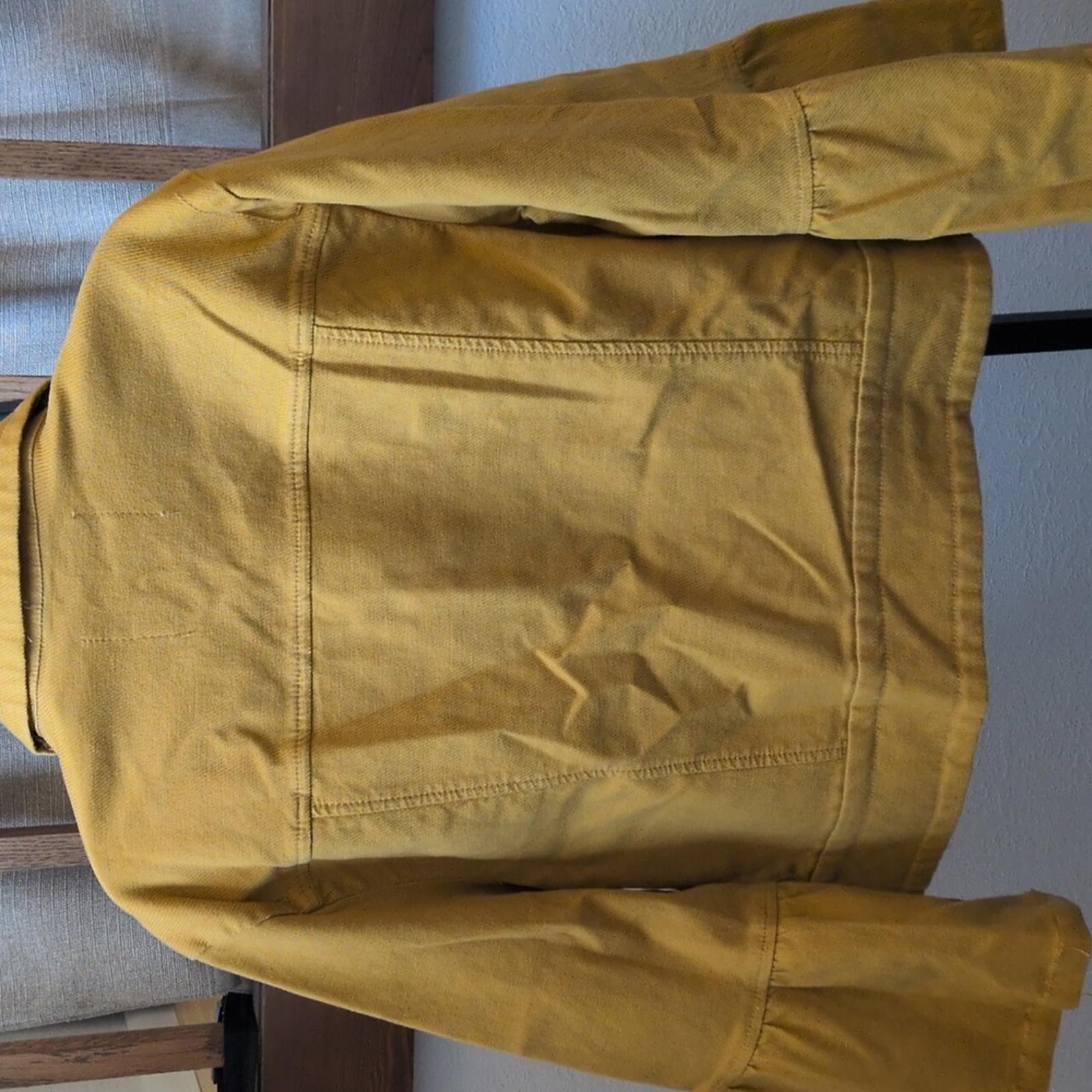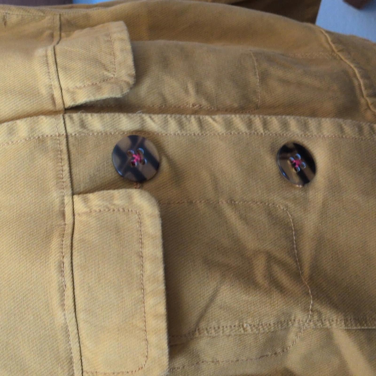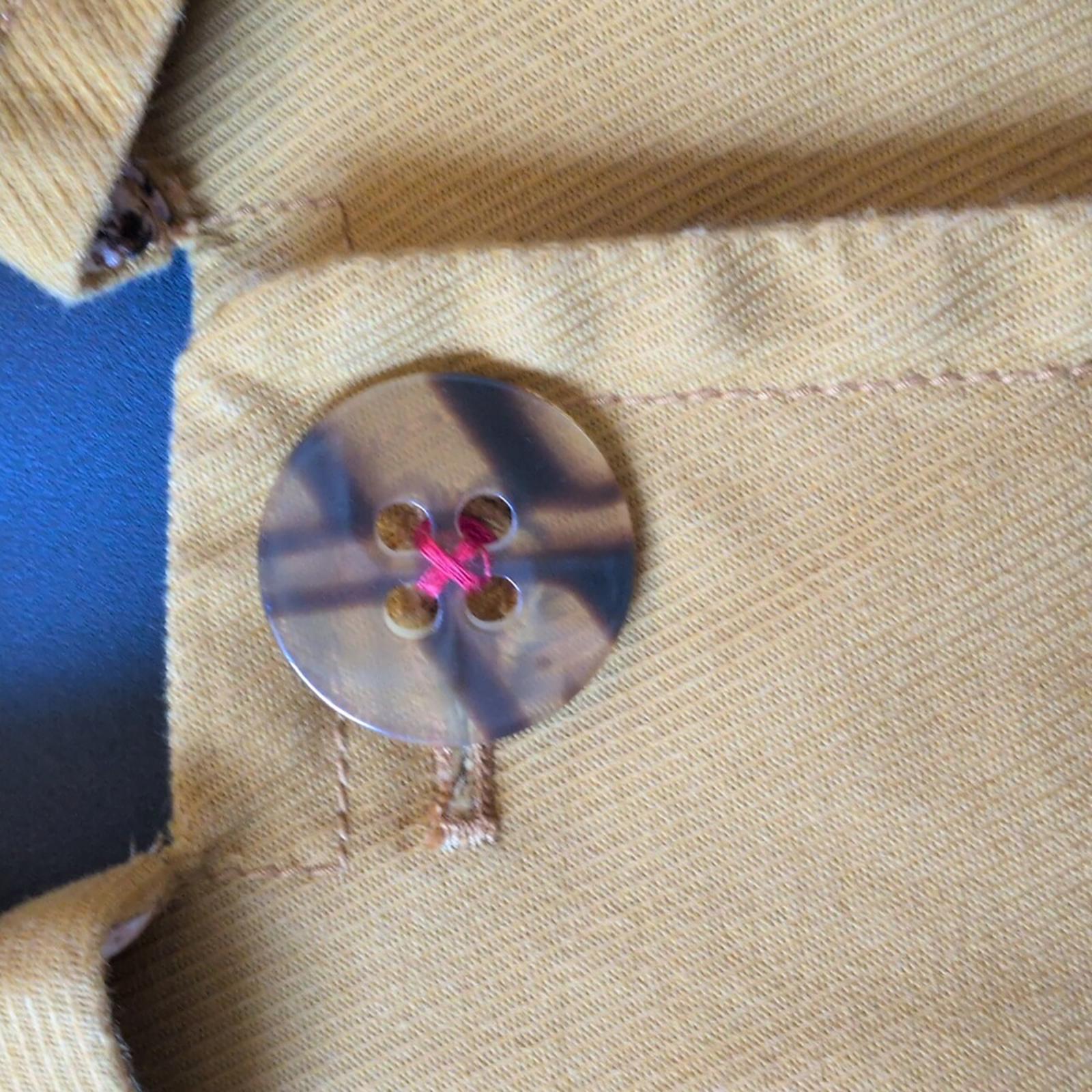 goldenrod yellow color with tortoiseshell buttons. pockets on the front.