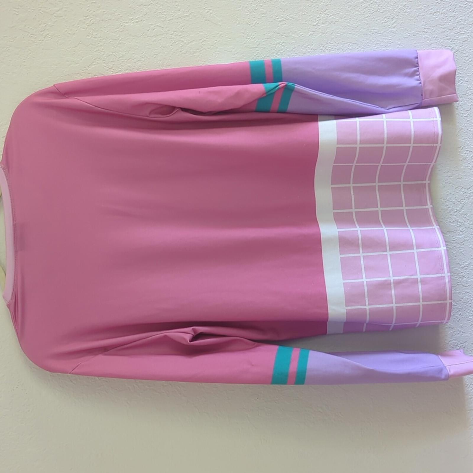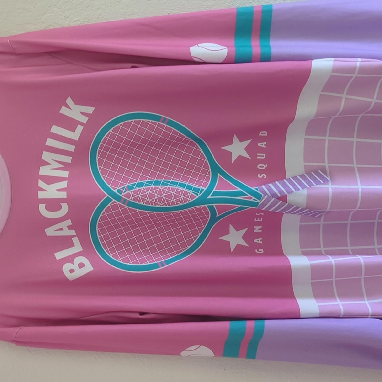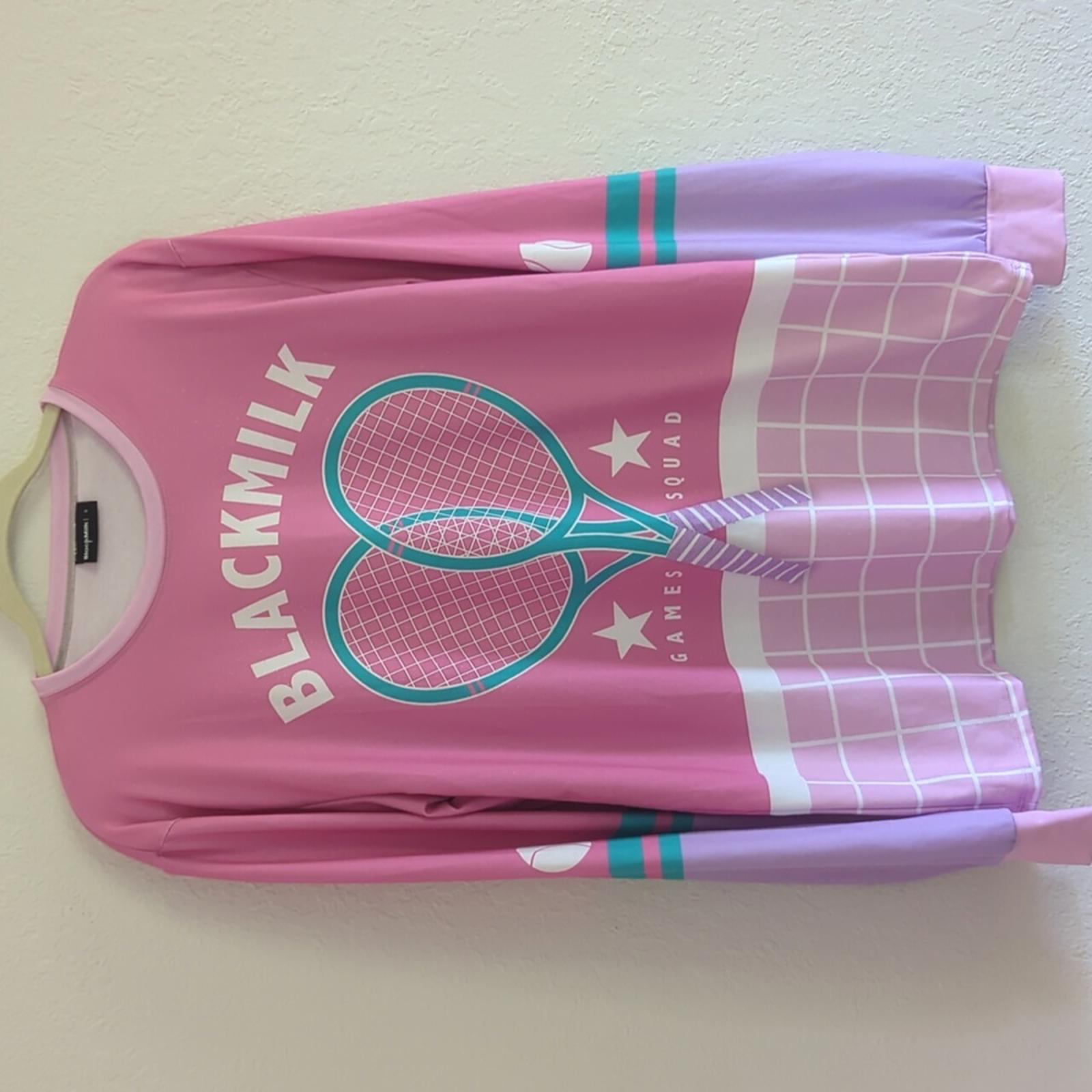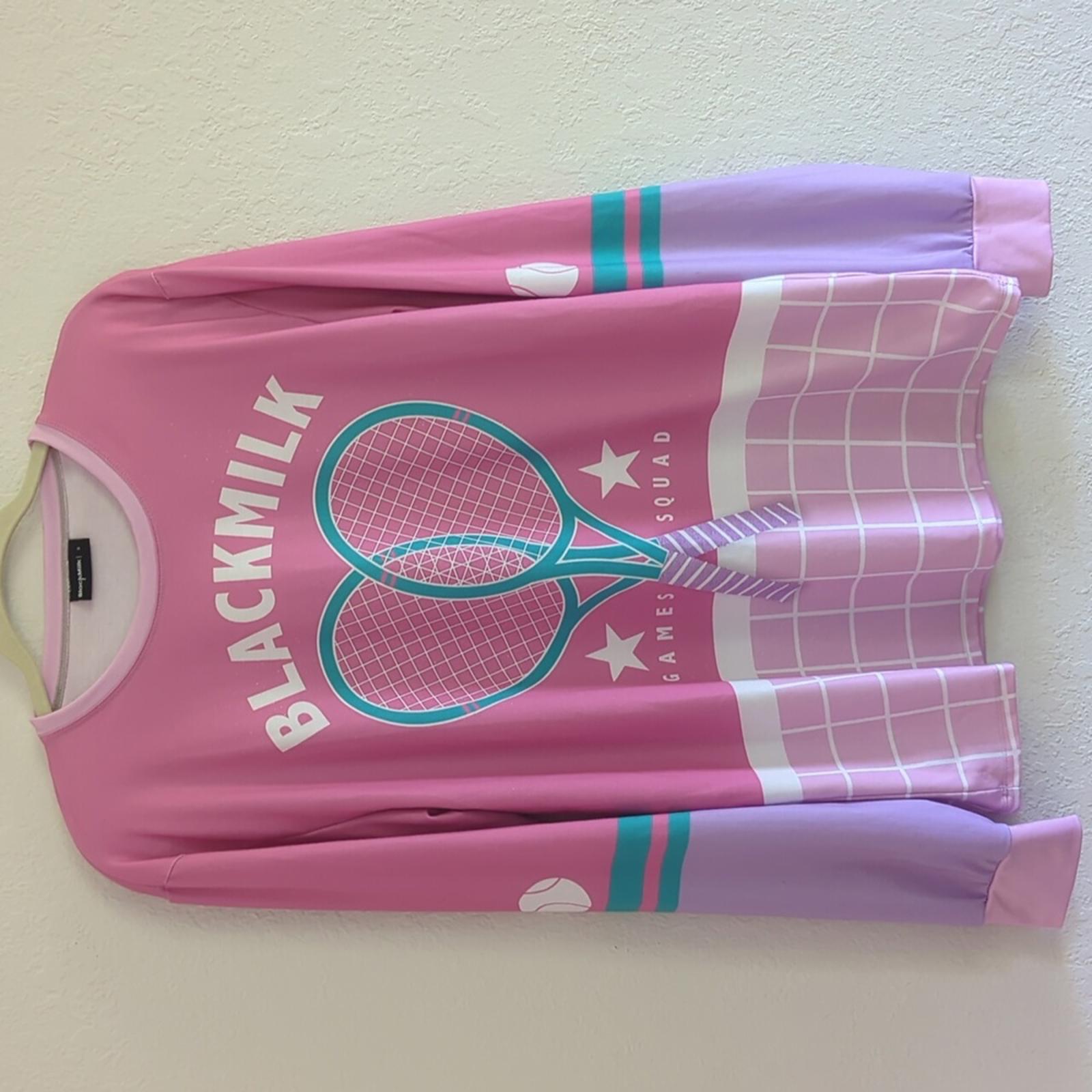 Limited edition! Black milk size small squad goals. long sleeve lightweight sweatshirt. Pink and purple main colors with teal rackets. has a little tennis balls on the elbows. Good pre-owned condition. some minor pilling from general wear.