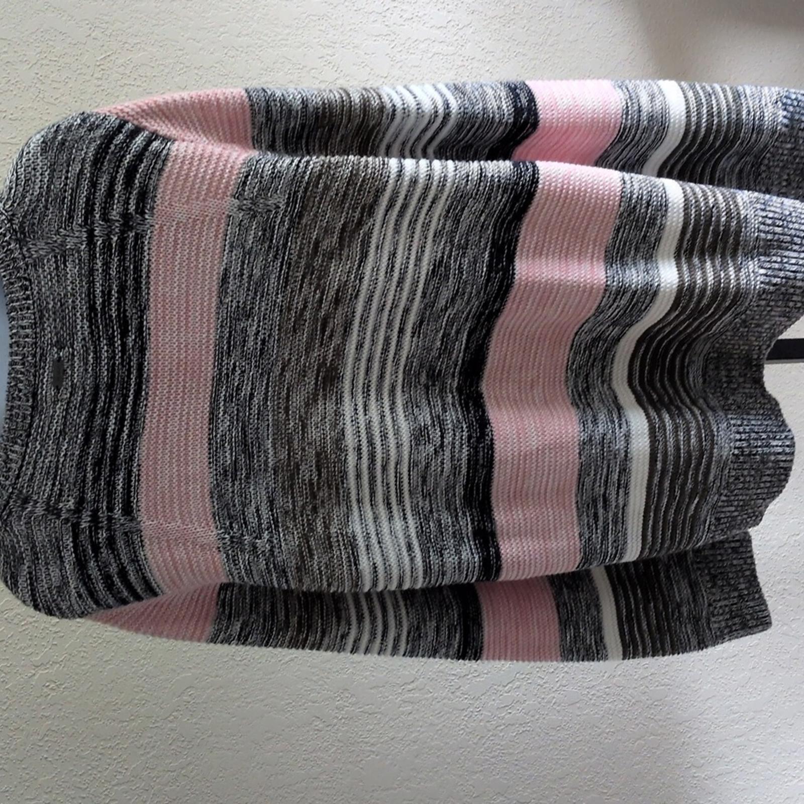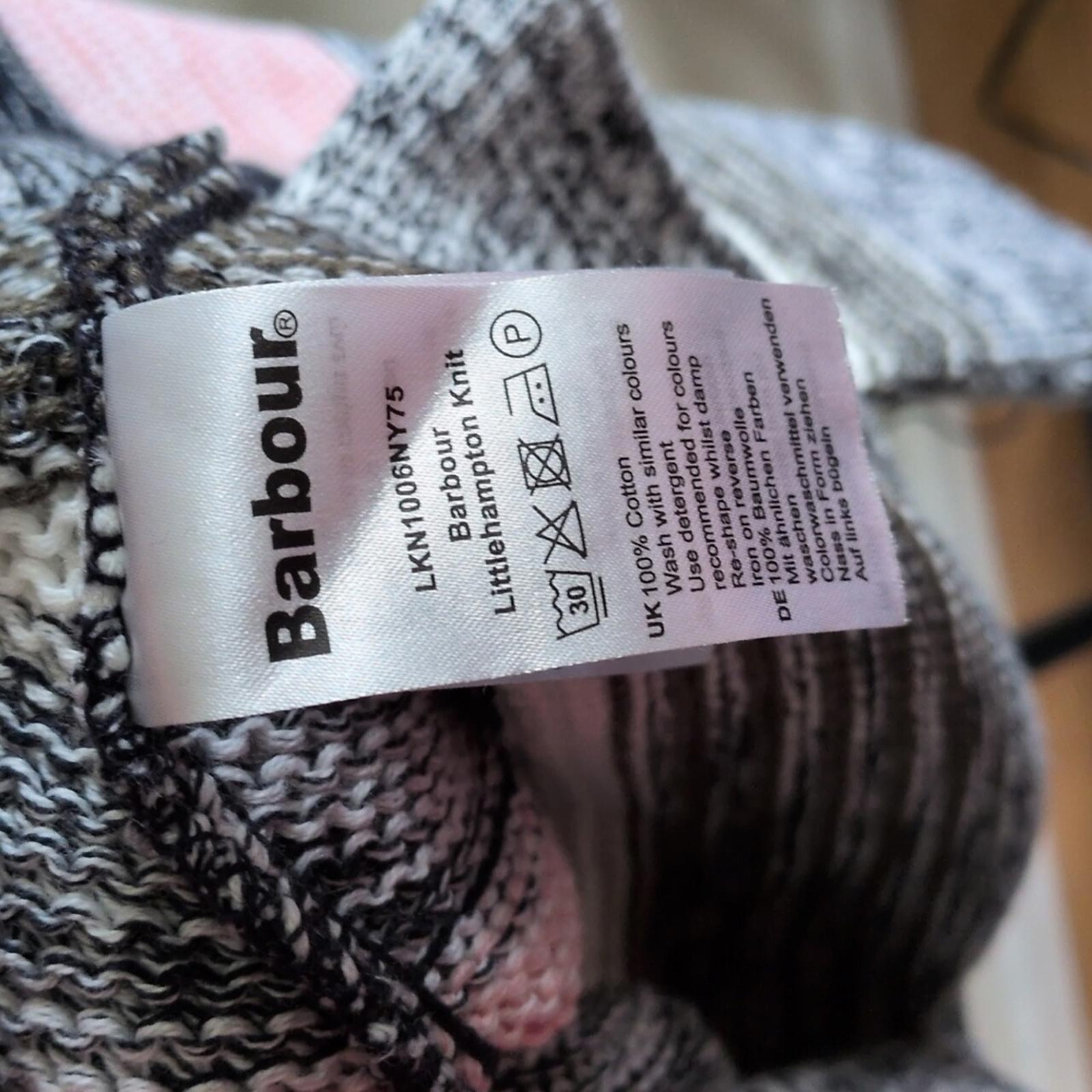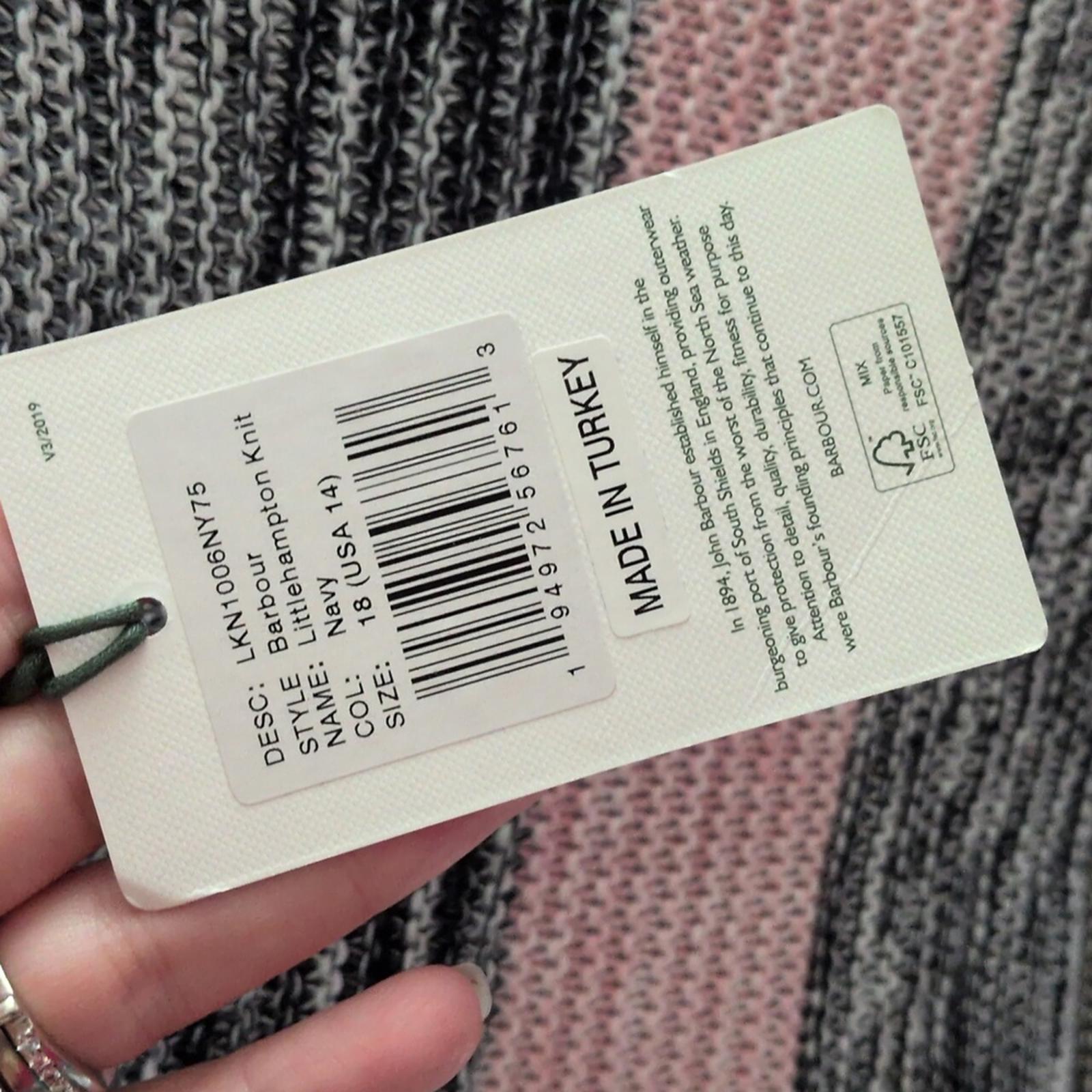 new with tagsBarbour Navy Stripe Little Hampton Sweater Size 14. pink grey army green and blue stripe alternation. nice knit. 100% cotton.
