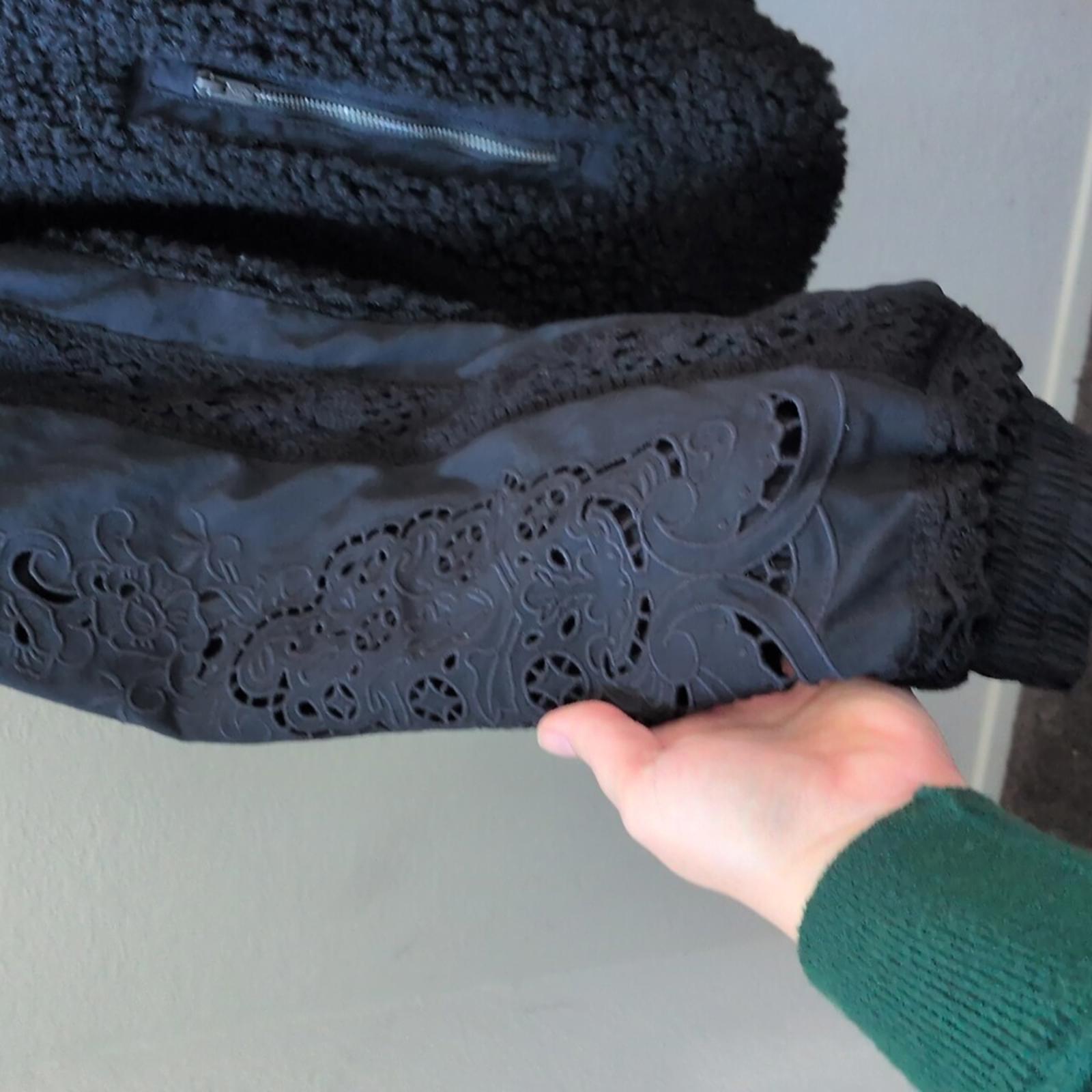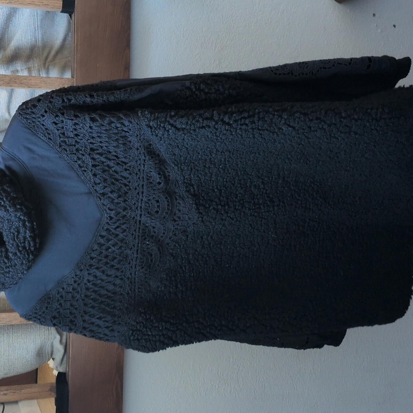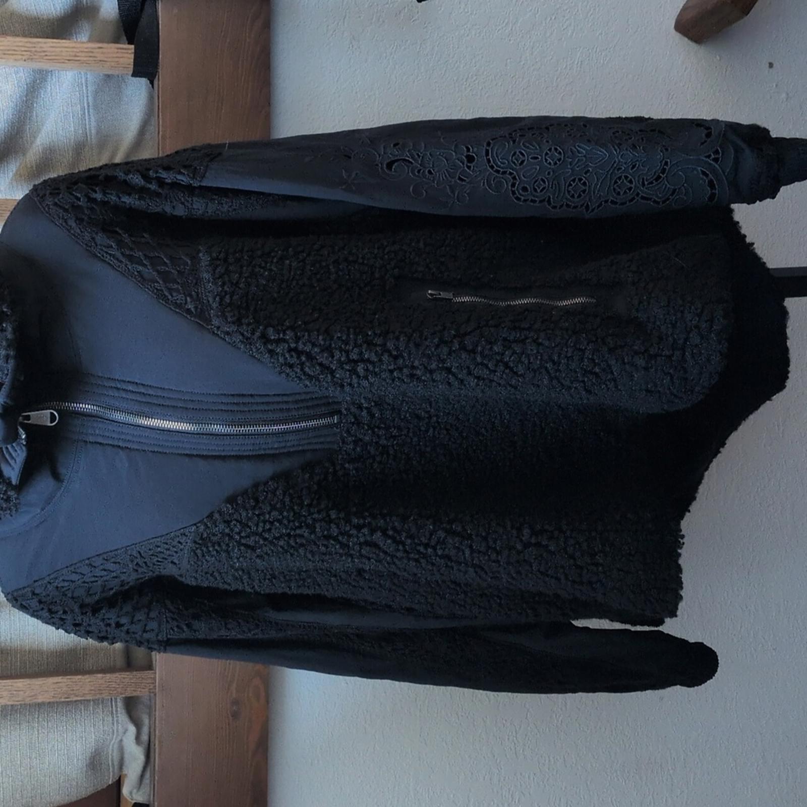 beautiful crocheted style sleeves and bodice. zips up in the front. Fleece body. zipper pockets on the sides. 100% polyester material