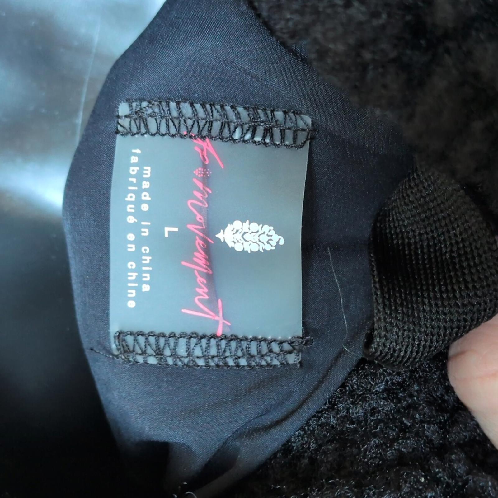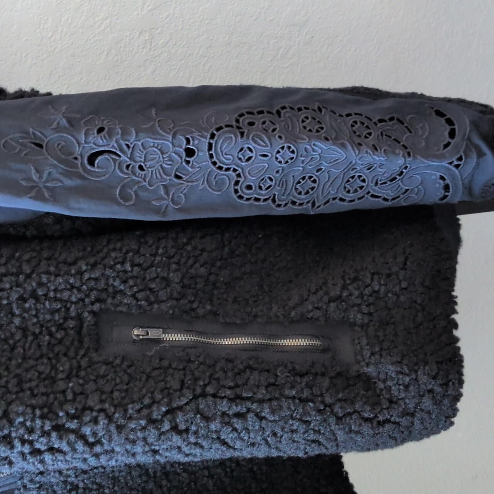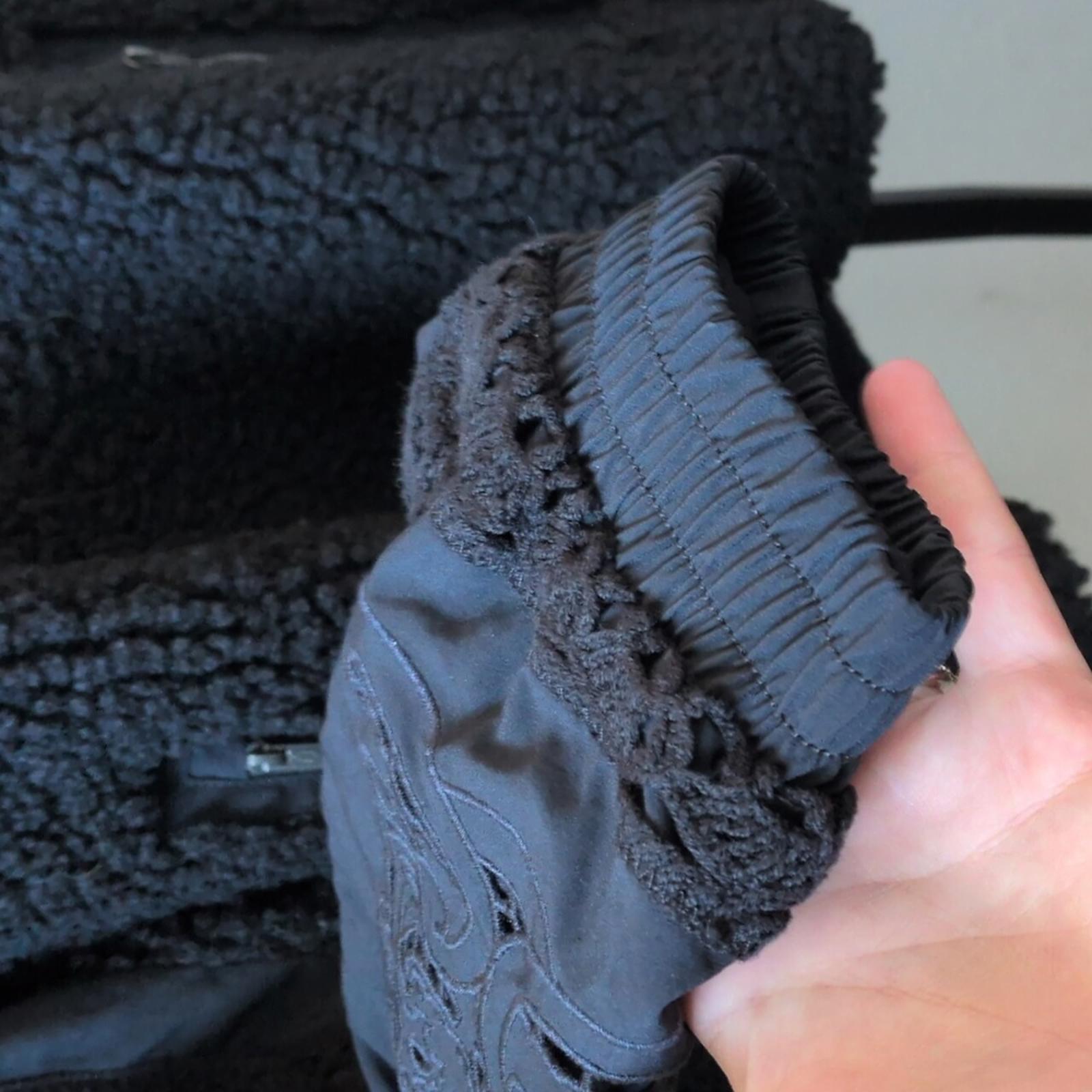 beautiful crocheted style sleeves and bodice. zips up in the front. Fleece body. zipper pockets on the sides. 100% polyester material