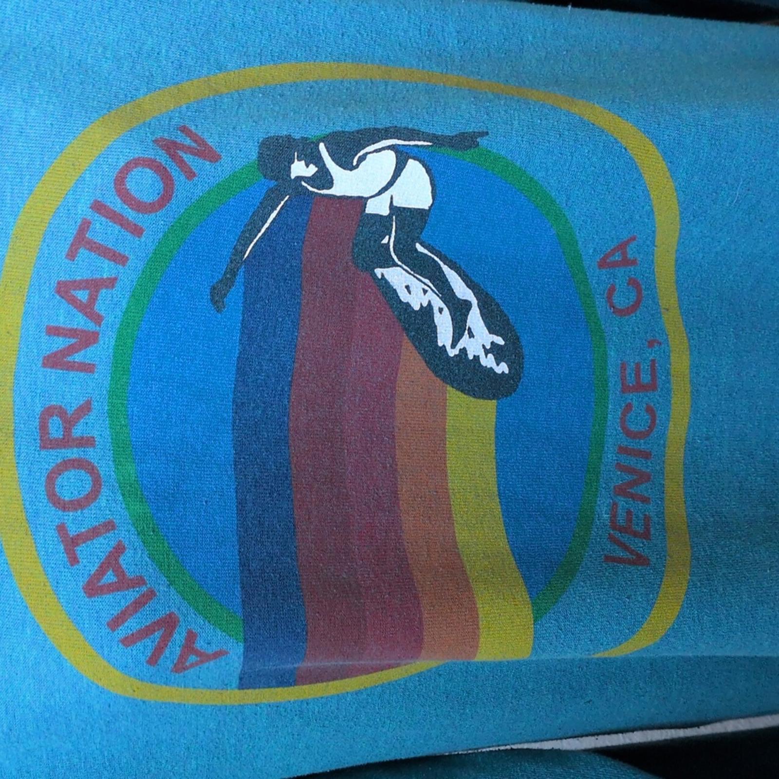 aviator Nation screen printed in rainbow colors along the wearer's right sleeve
