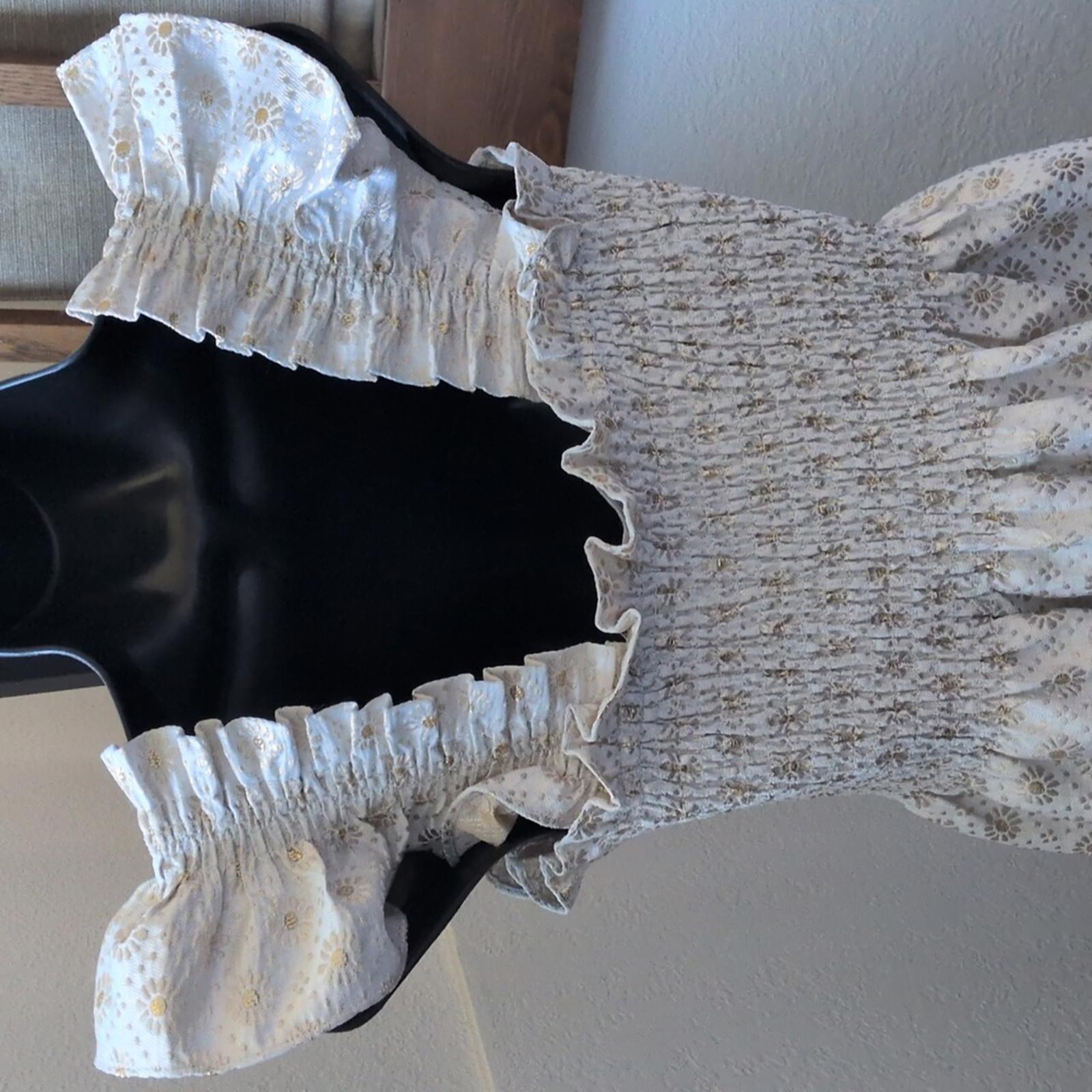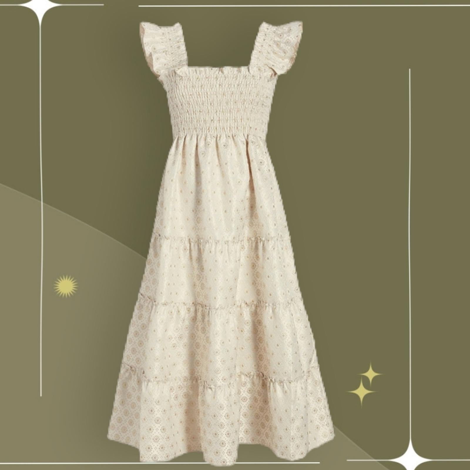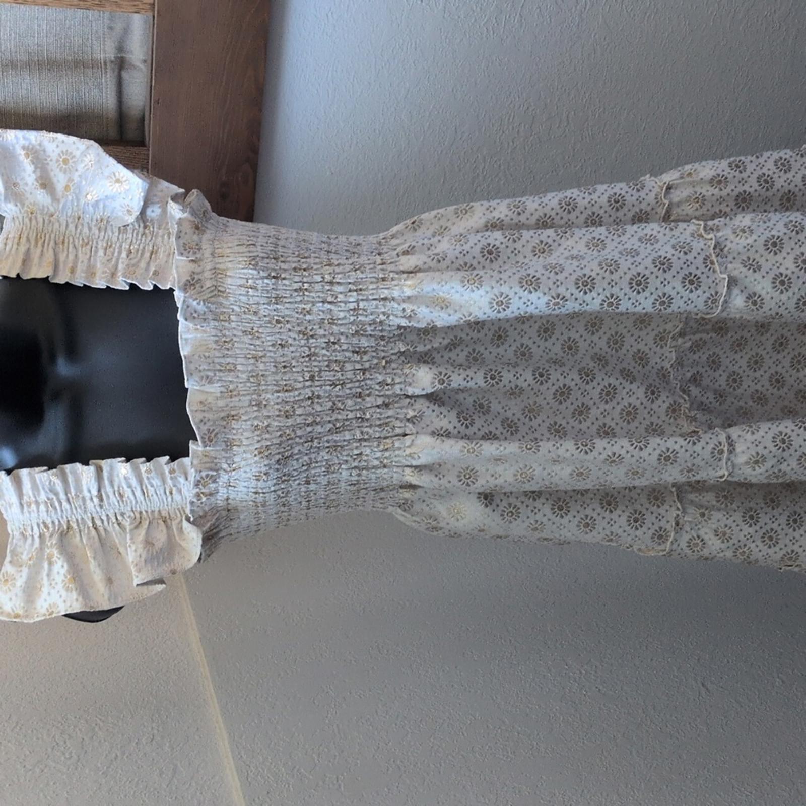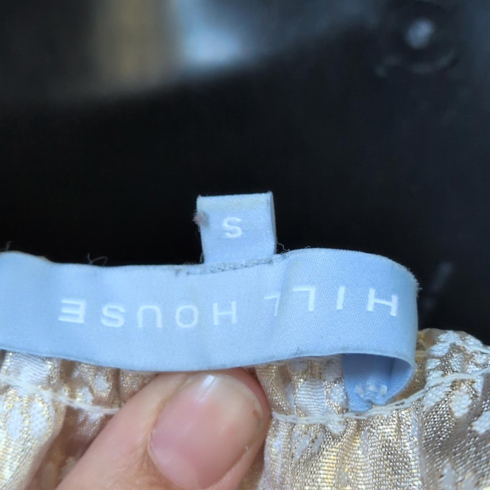 Hill house Home Gold Jacquard Ellie Nap Dress Size S. White background with gorgeous gold floral detailing. elastic bodice with elastic flutter sleeves