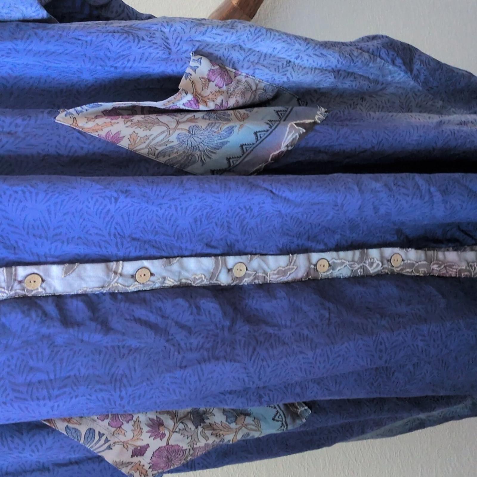 Kantha Bae Duality Maxi Moo. One size fits most. wood like buttons up the front. two floral pockets. extremely soft silky material. one size fits most, however, this item is extremely oversized. recommend for a size medium to a 2XL