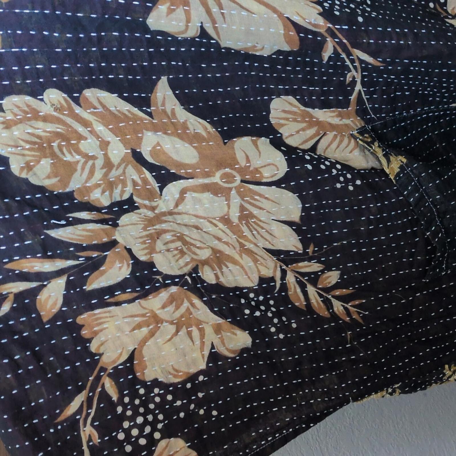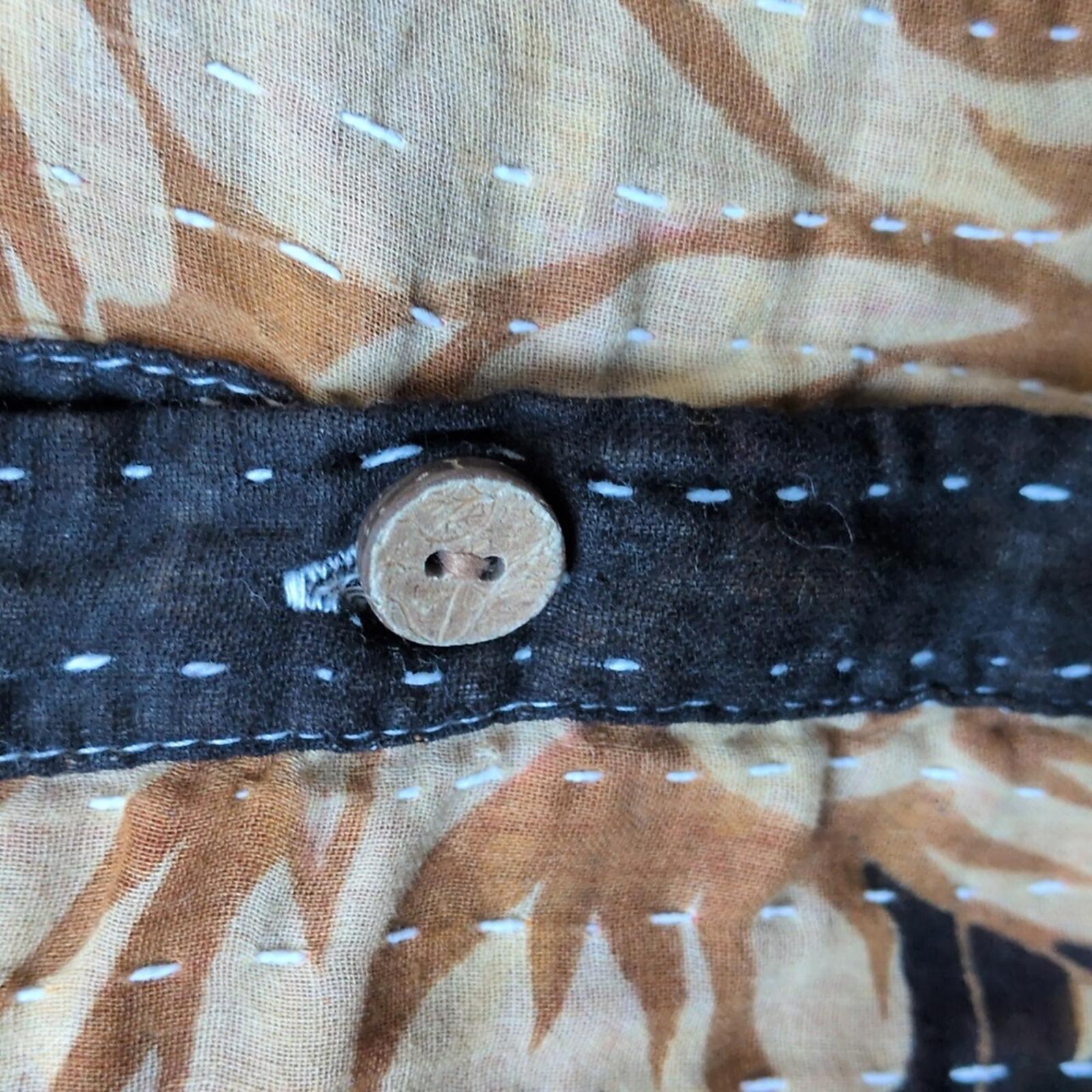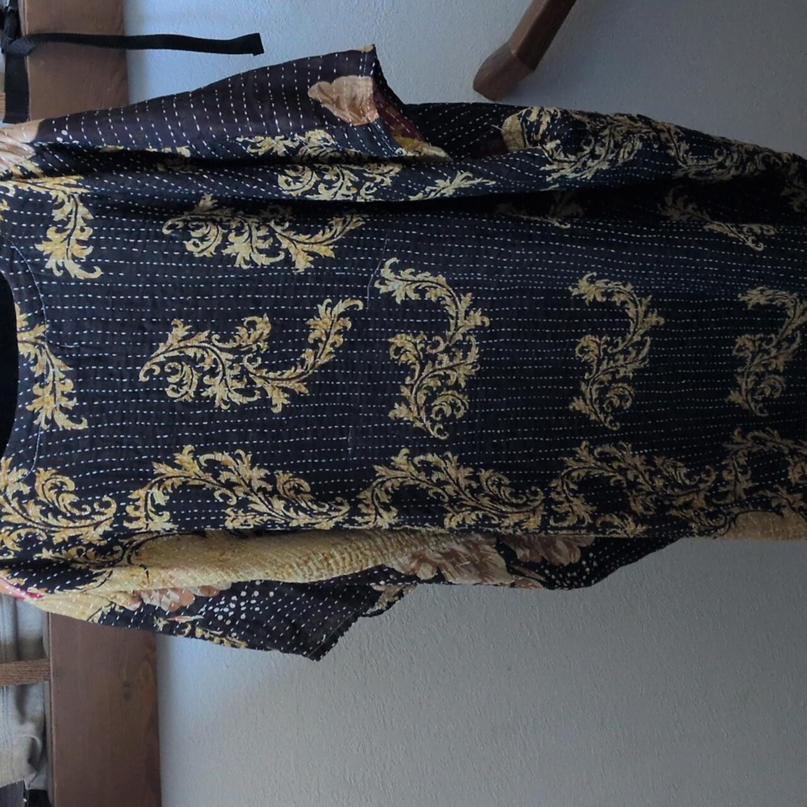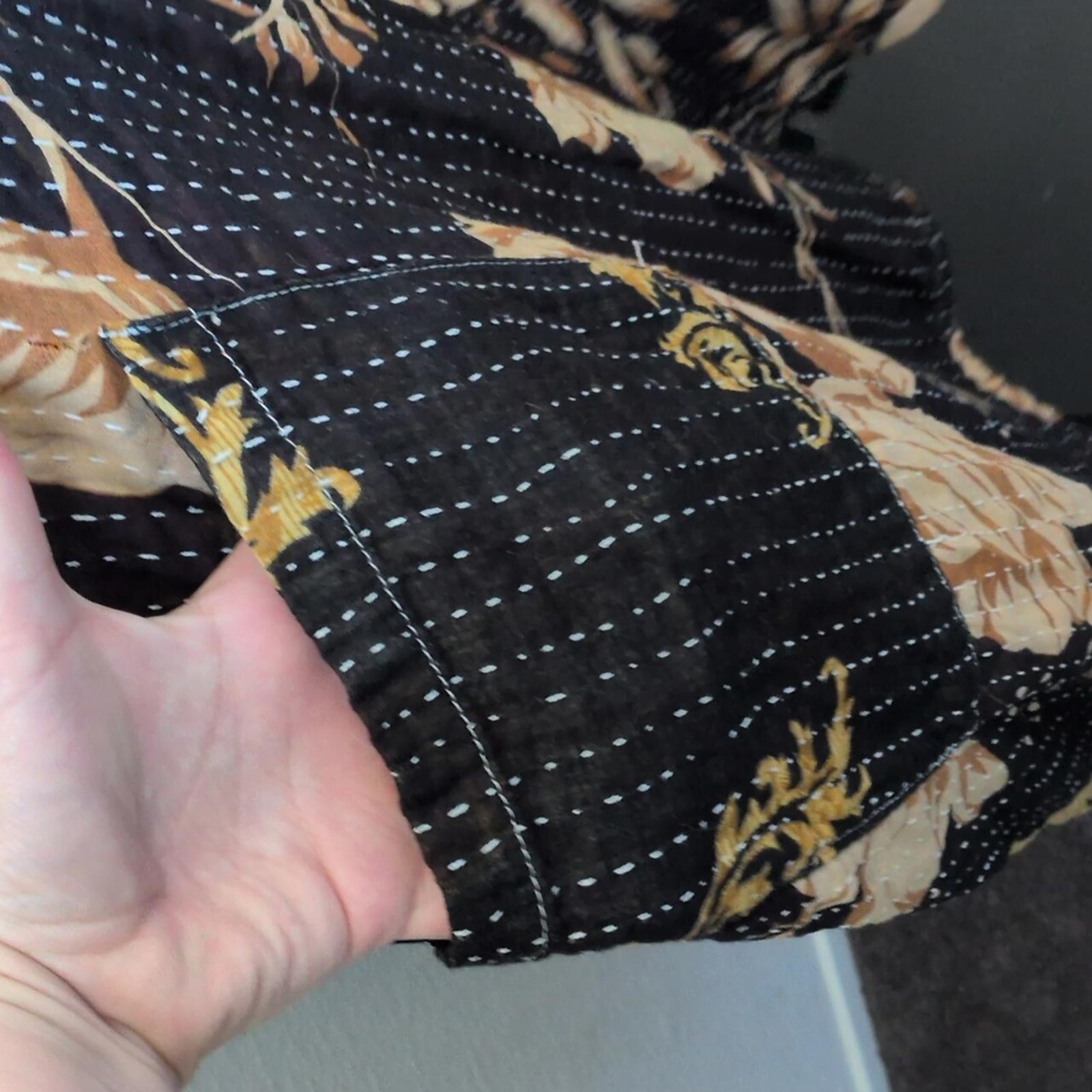 Kantha Bae Midi Moo Dress Gold Floral osfm . has two pockets near the bottom. Wood style buttons. Nice oversized loose captain fit. can be worn either as a dress or as a beach. cover-up.