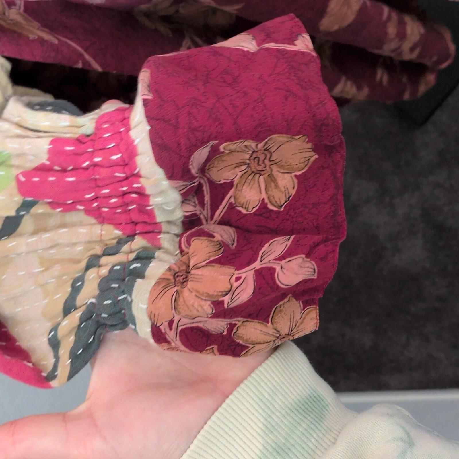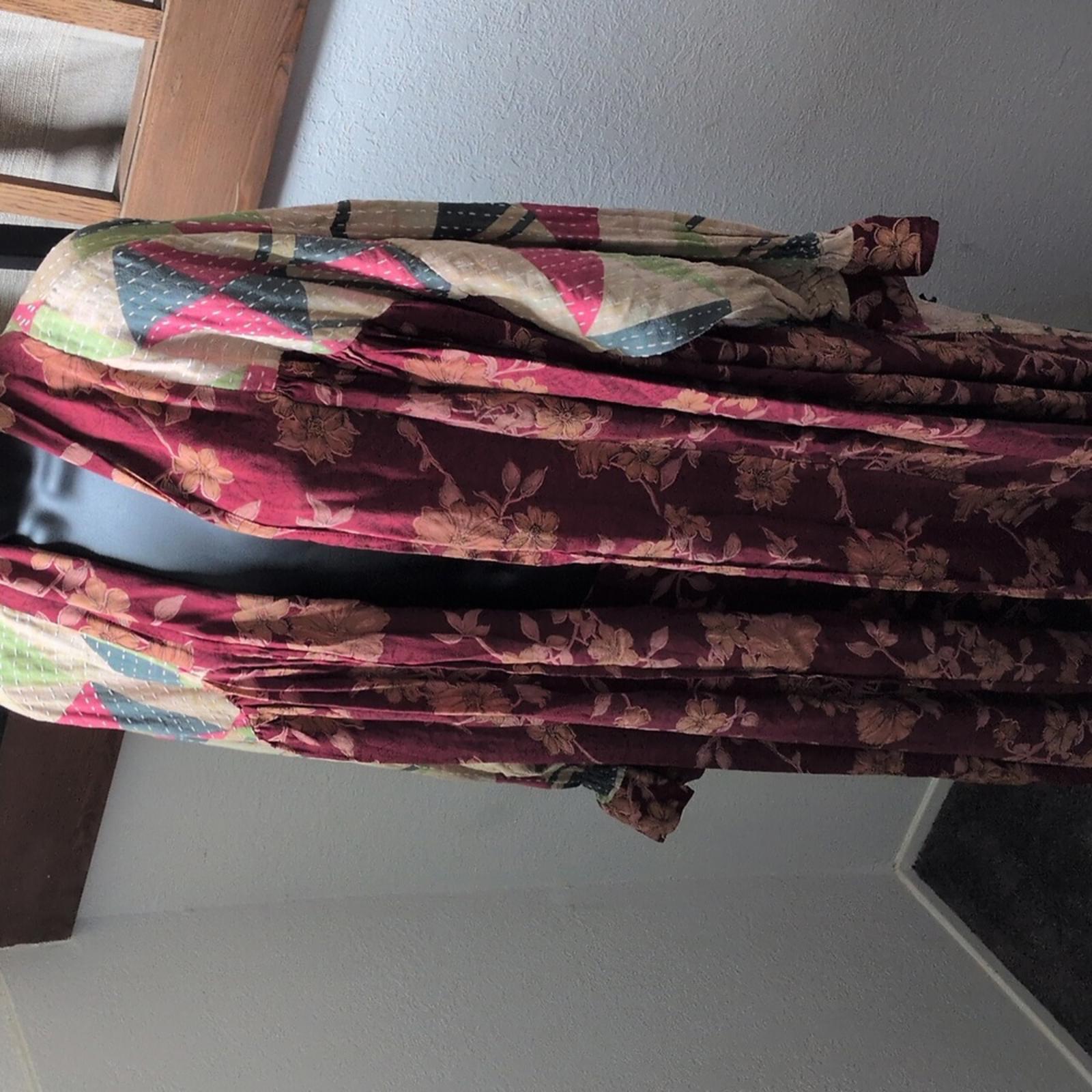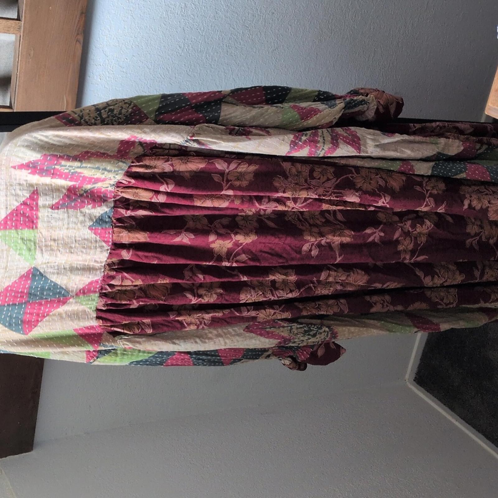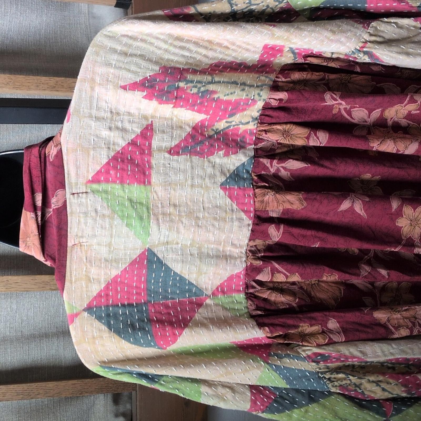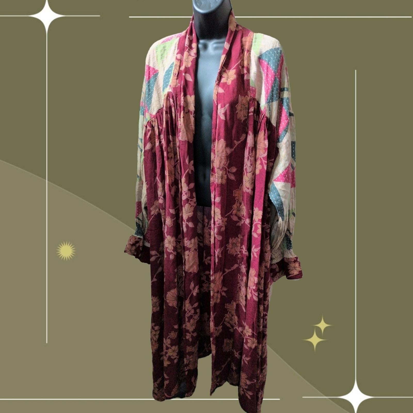 gorgeous kantha Bay Utopia duster kimono. features a mixed sorry cloth with a silk blend. has burgundy floral and geometric on kantha.