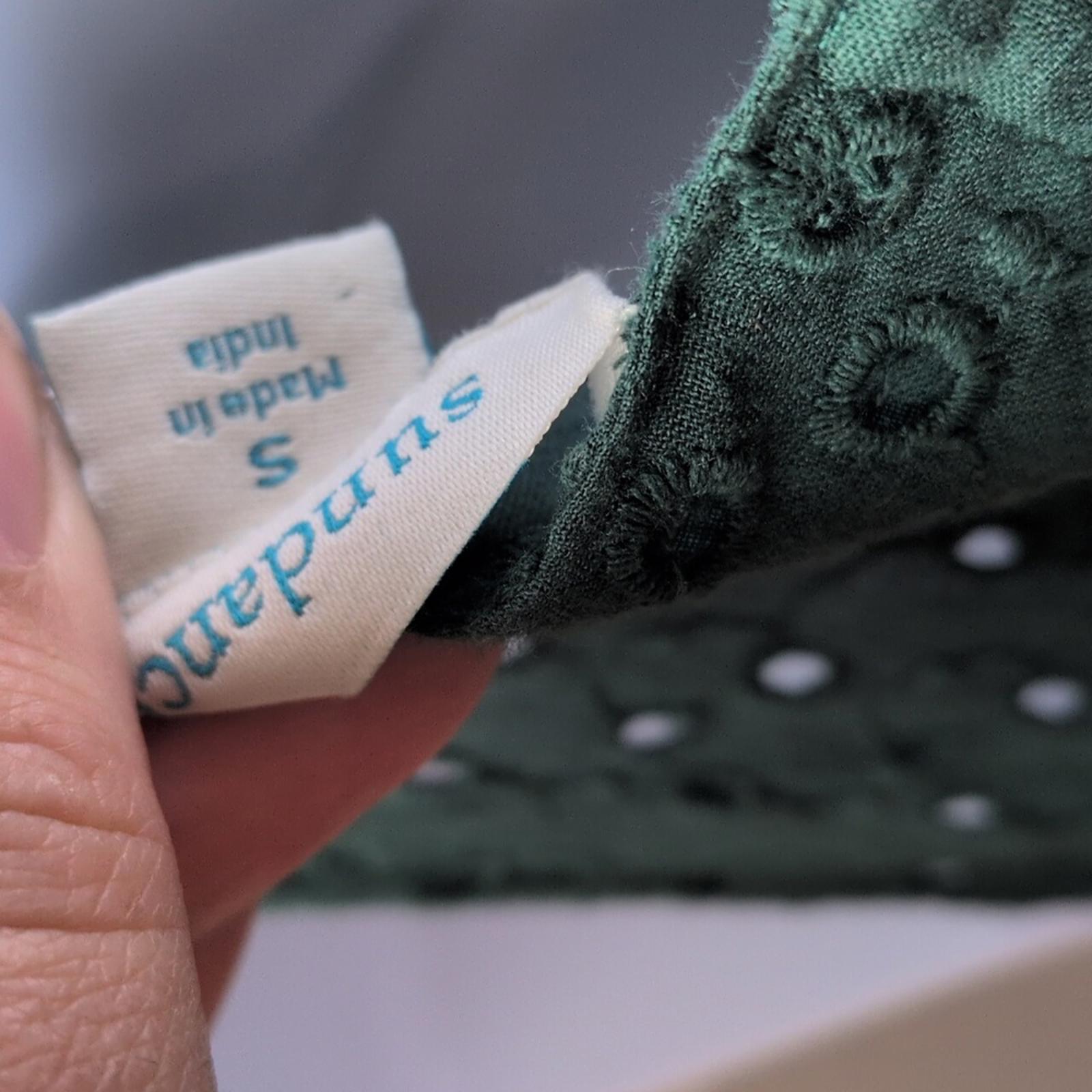 Sundance Autumnal Dreams Dress Size Small. dark green. v-neck eyelet top with gorgeous flowy skirt. button in back. has slip with dress in same color.