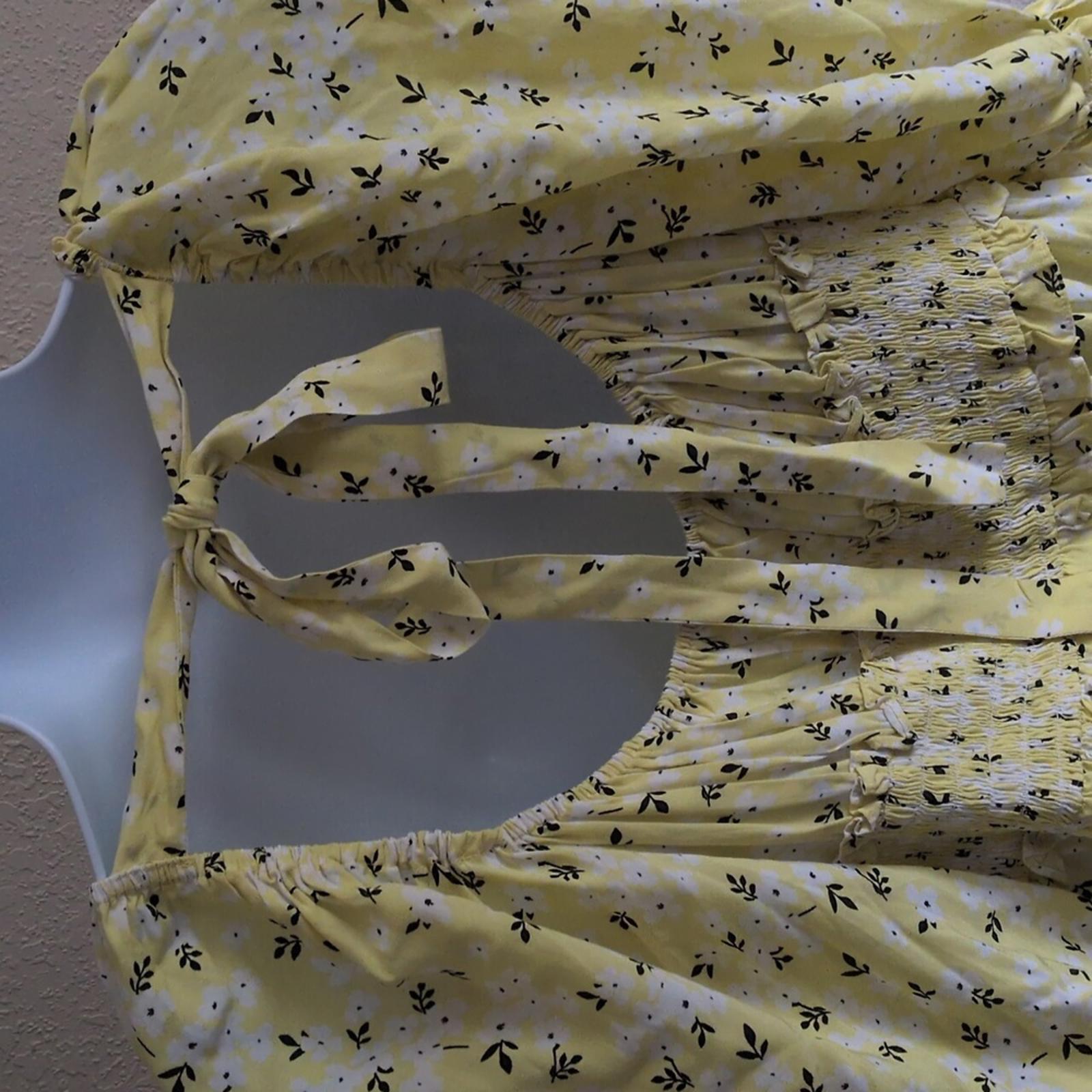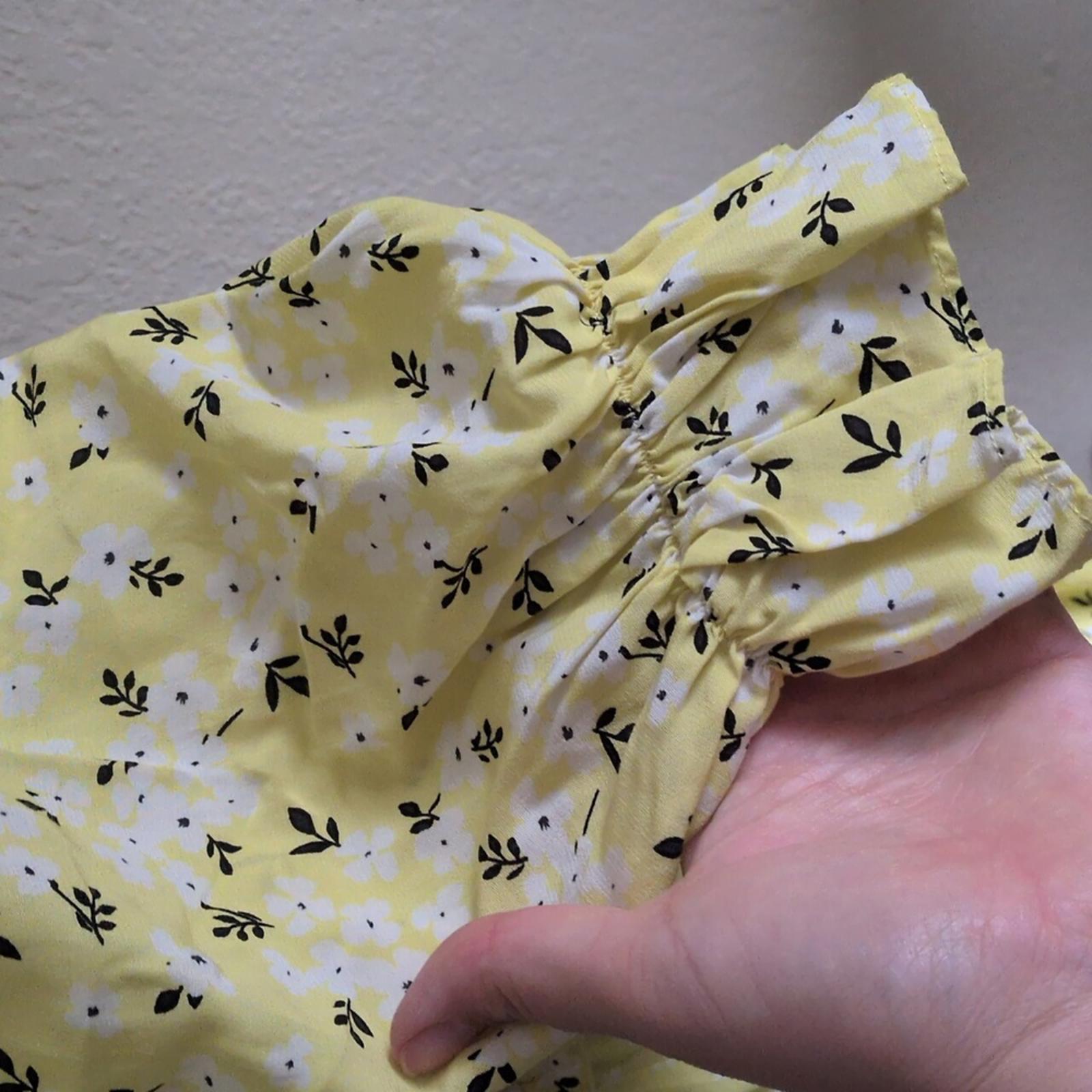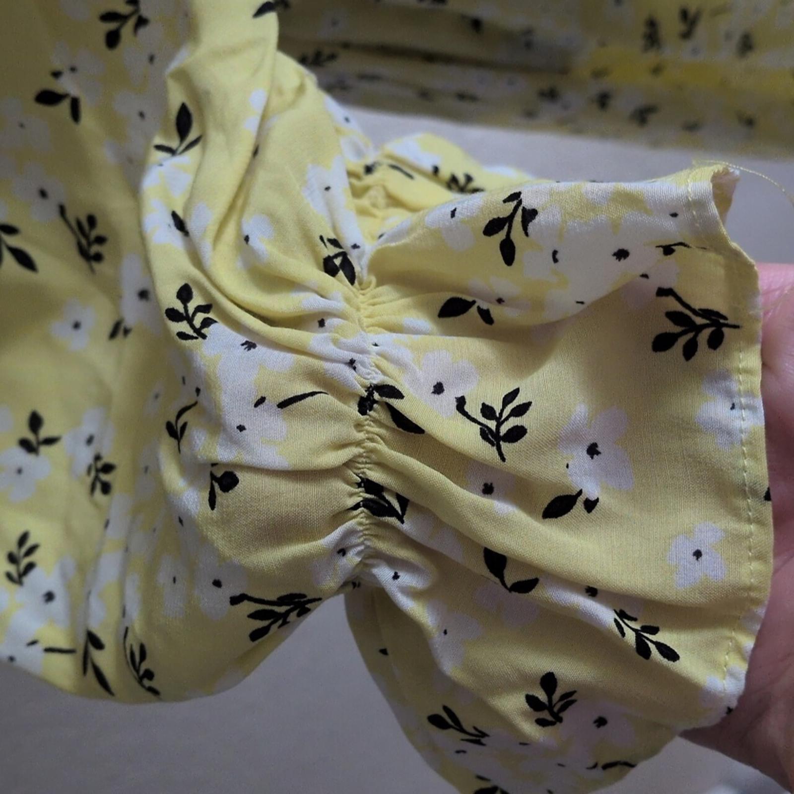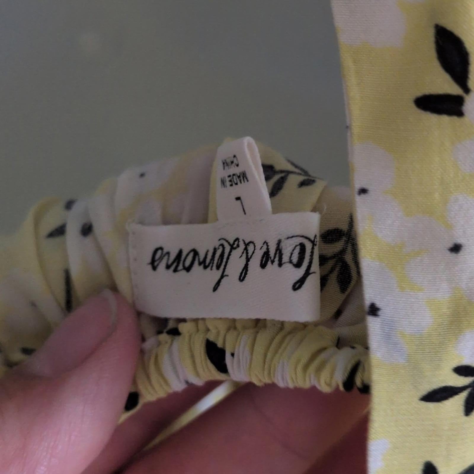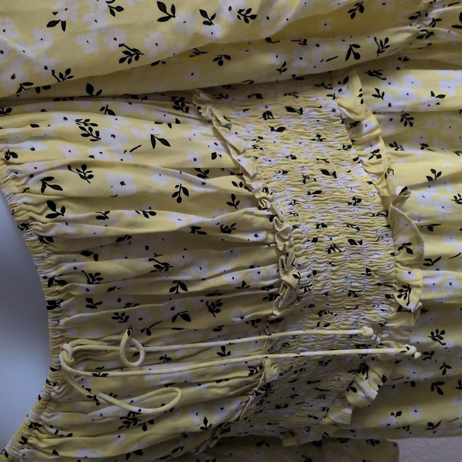 For Love and Lemons Chrysanthemum Midi Dress in Lemonade Sz L. has tie in back and elastic waistband. beautiful buttery yellow color with white flowers. small slit in front on left side. puff sleeve with elastic at ends.