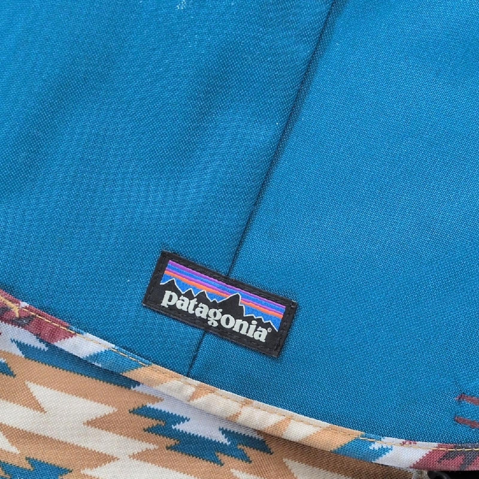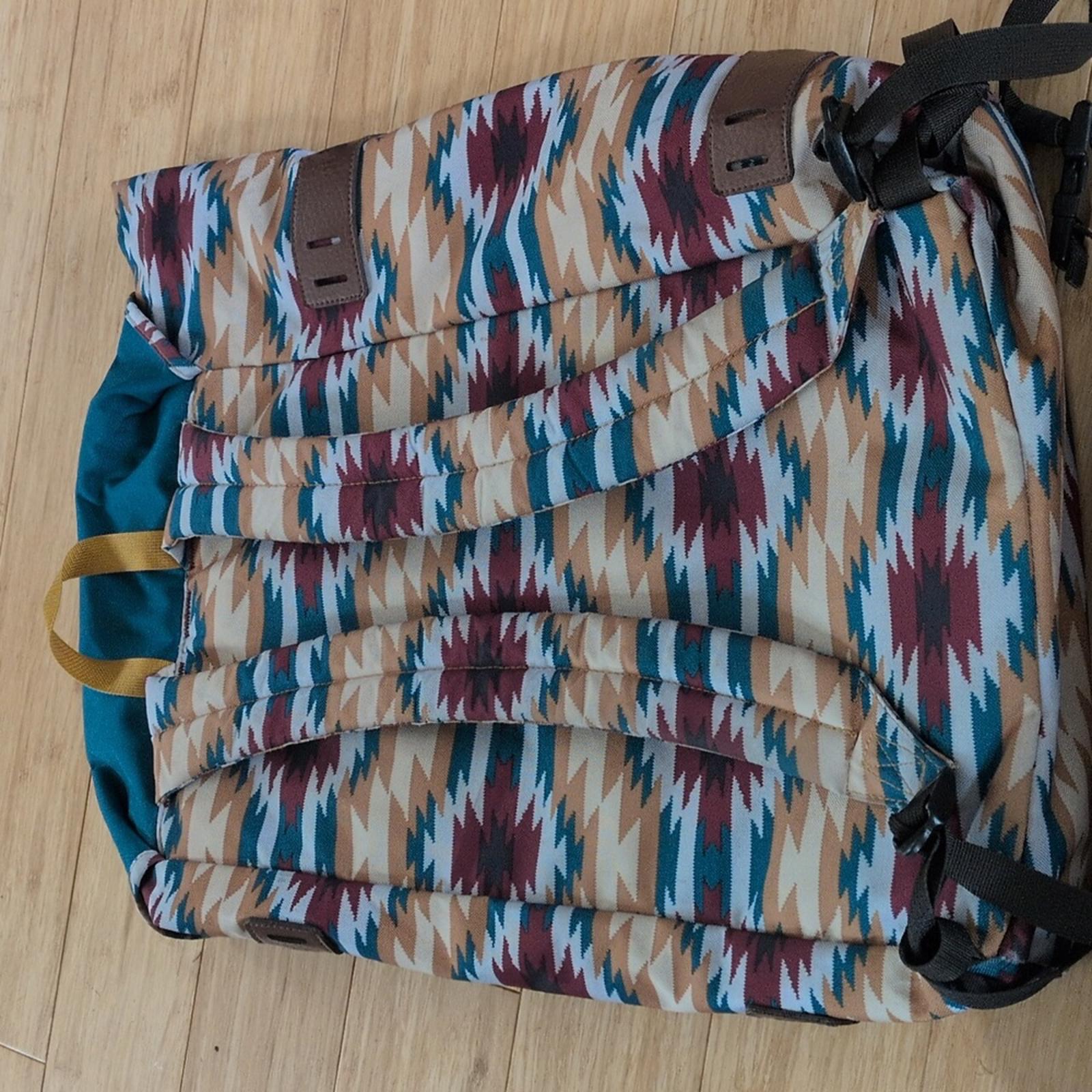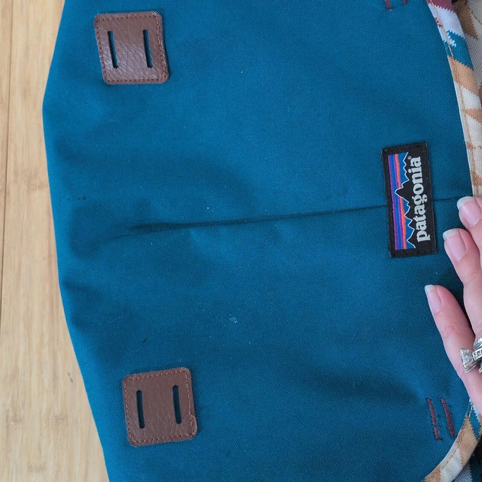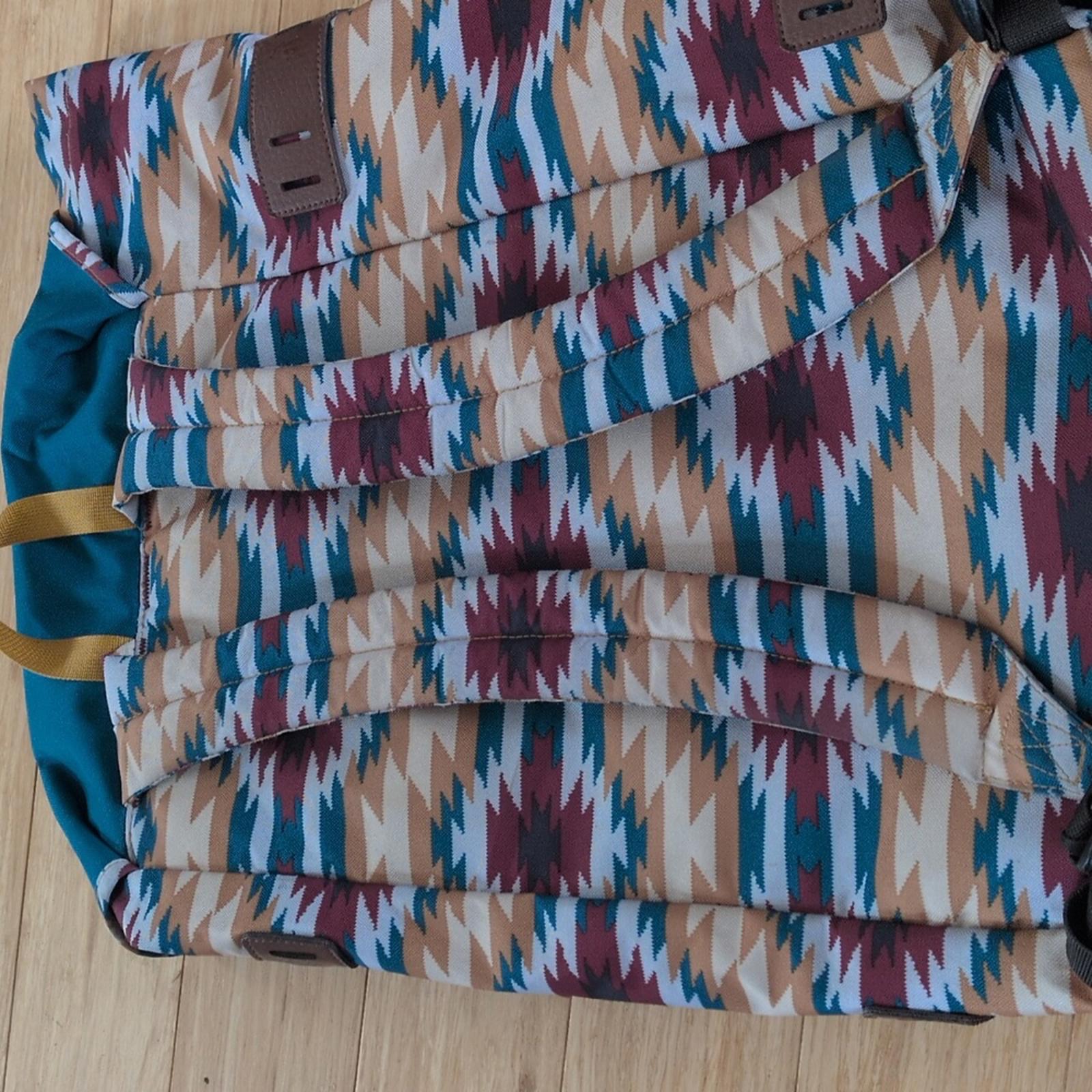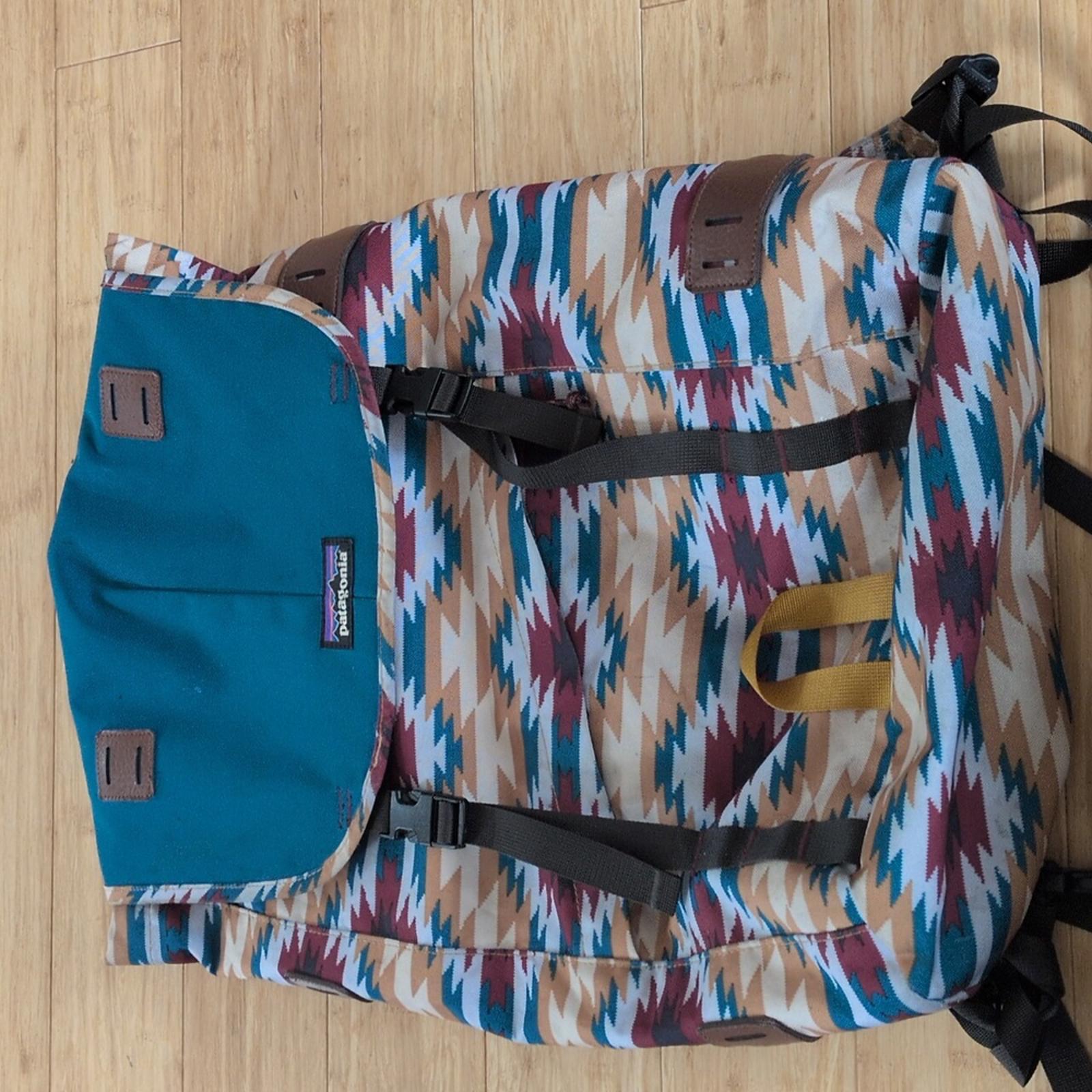 arbor pack 26" by Patagonia - blue and burgundy Aztec pattern made with Recycled polyester- lightweight and durable