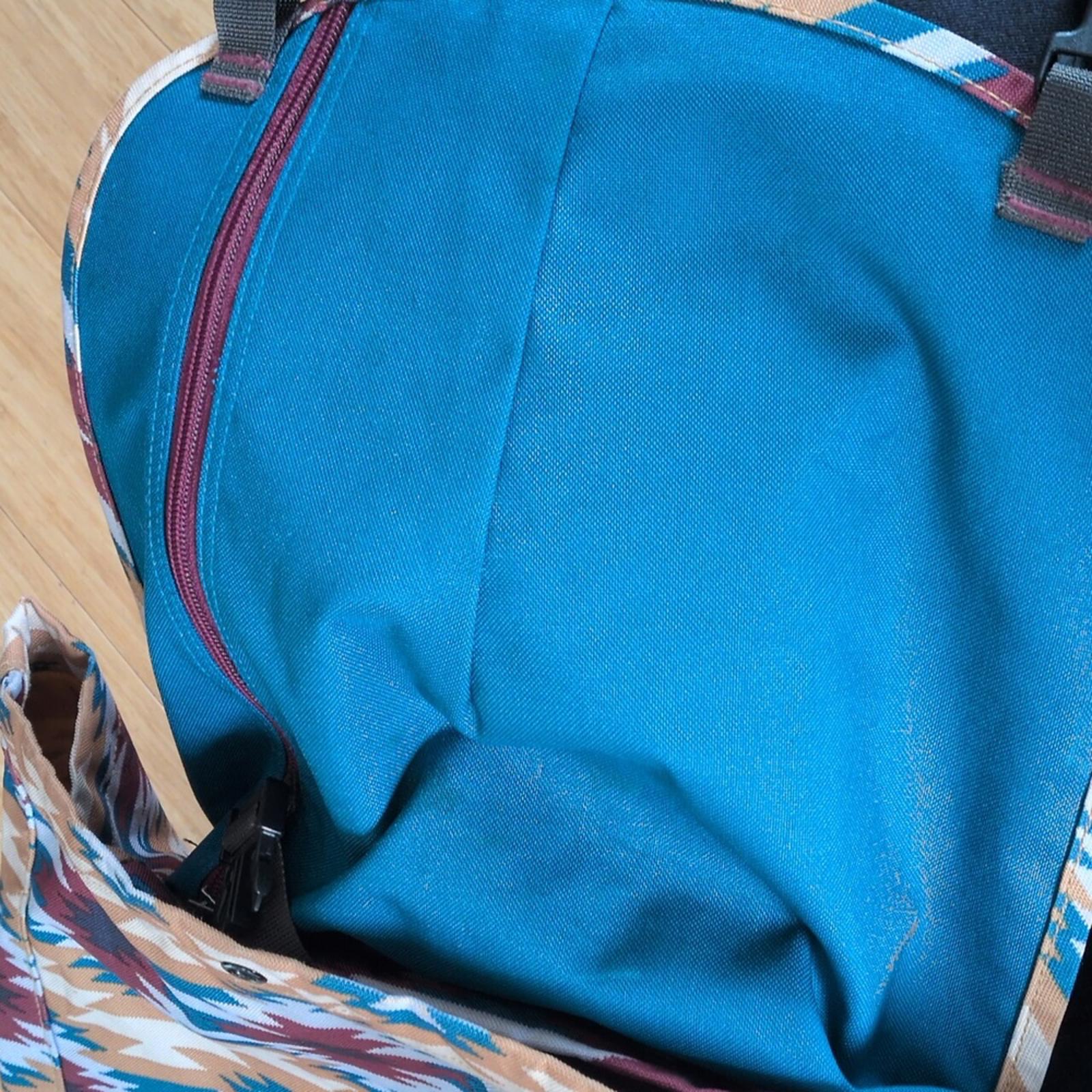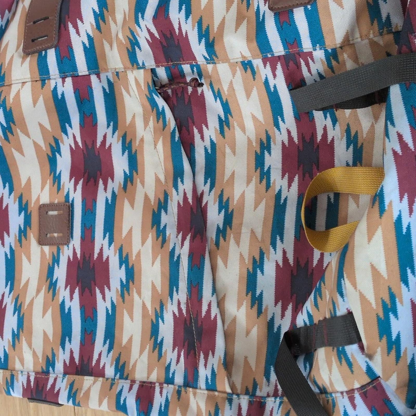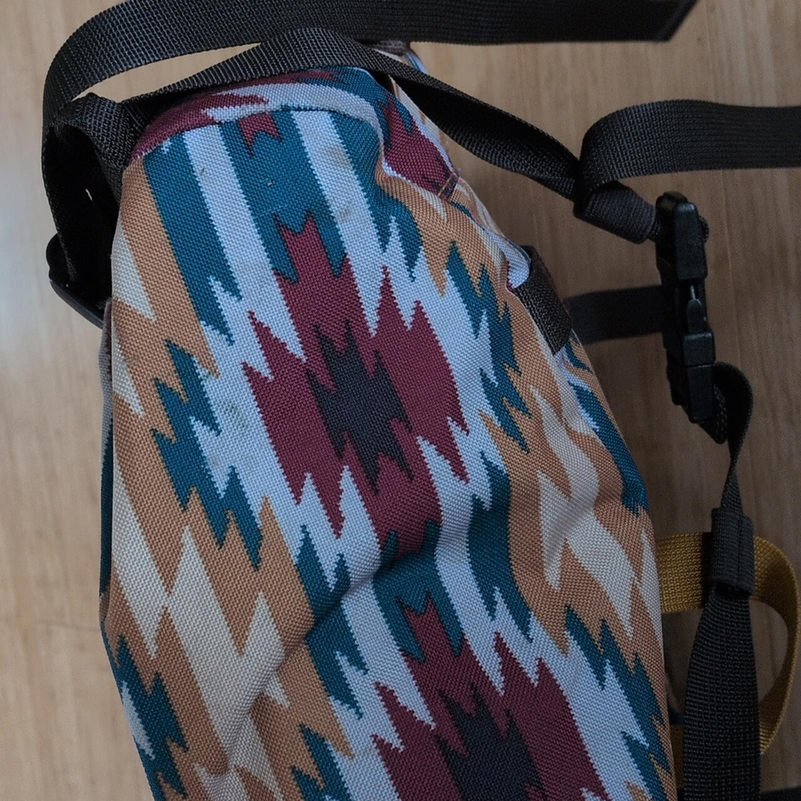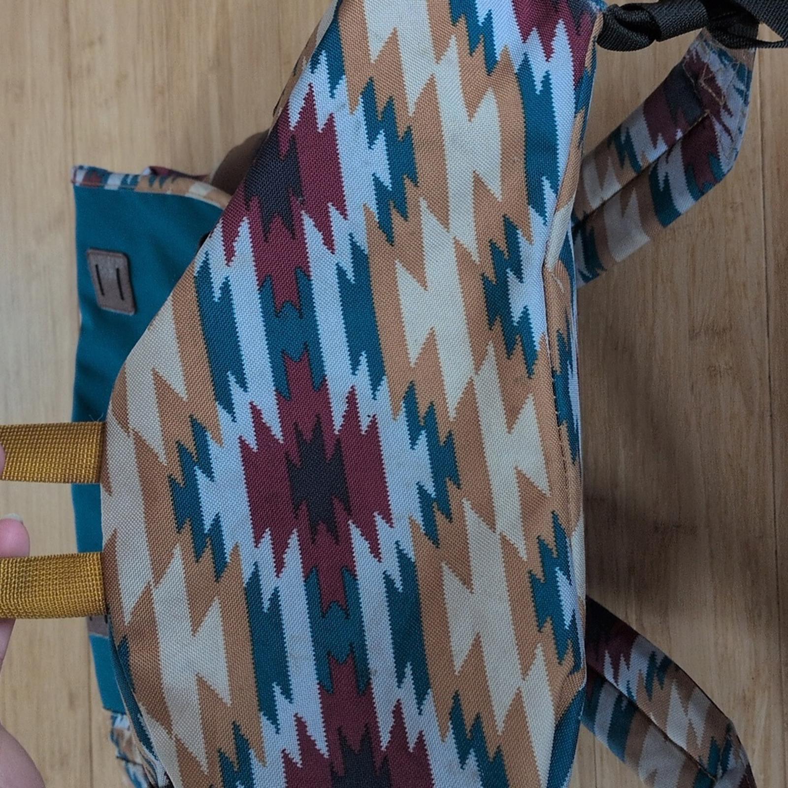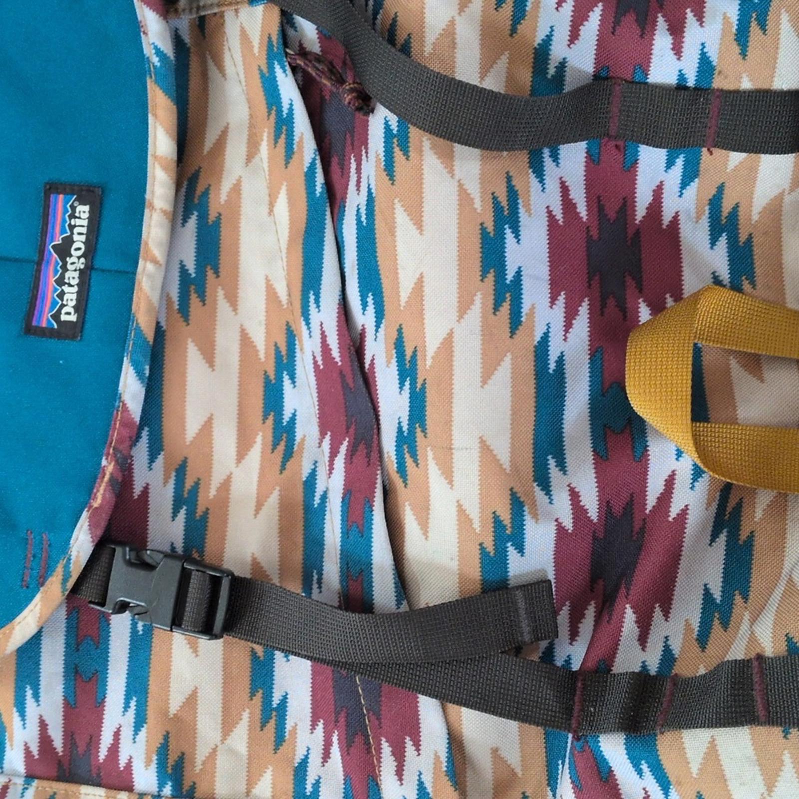 arbor pack 26" by Patagonia - blue and burgundy Aztec pattern made with Recycled polyester- lightweight and durable
