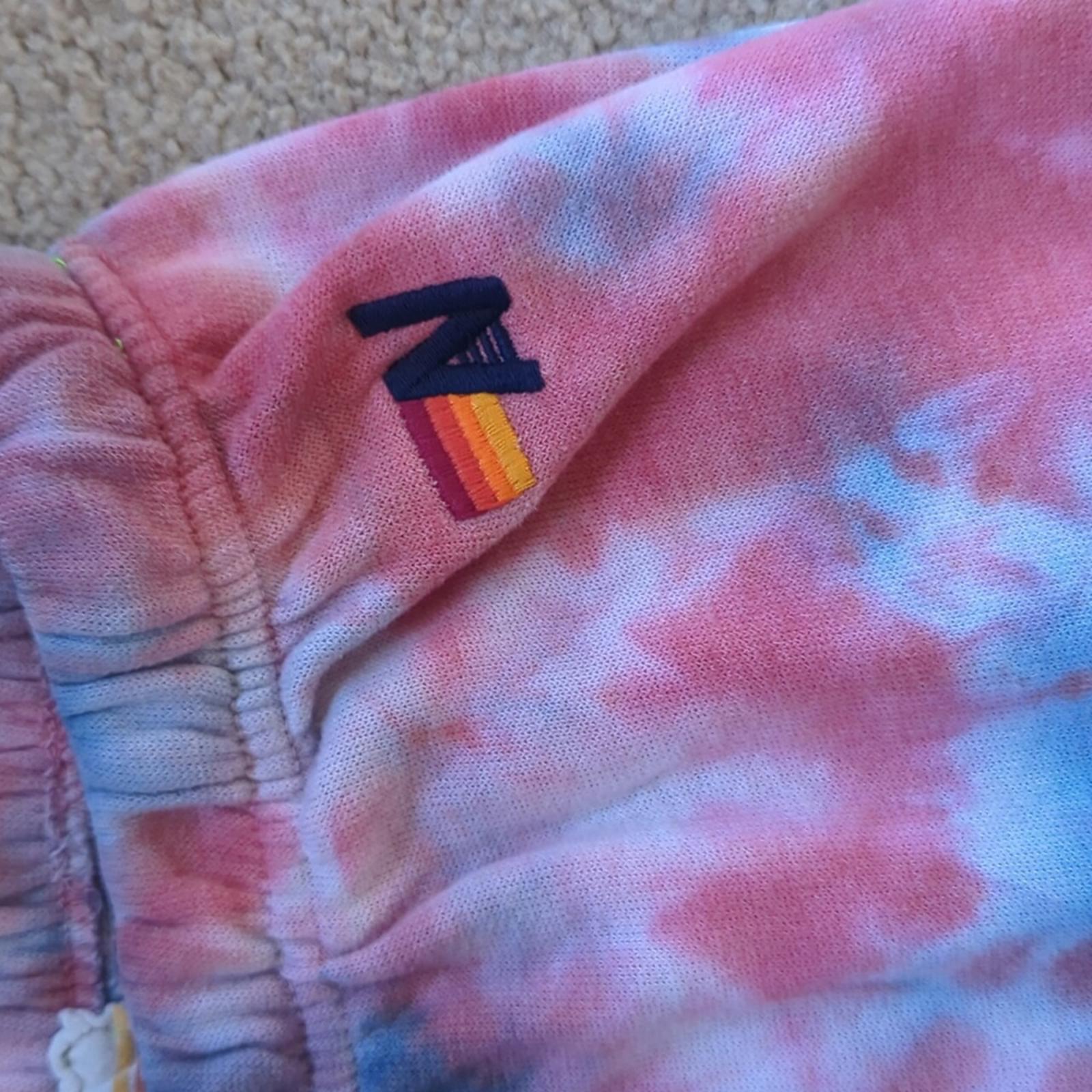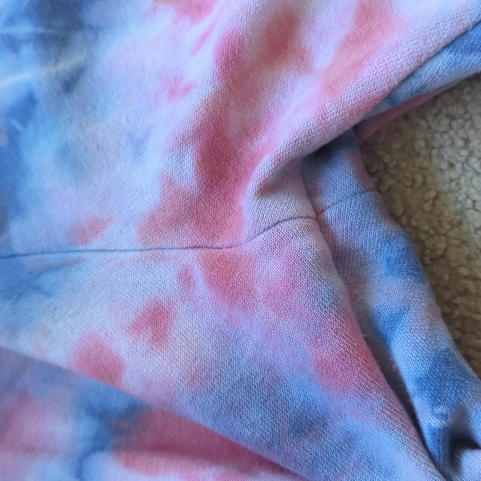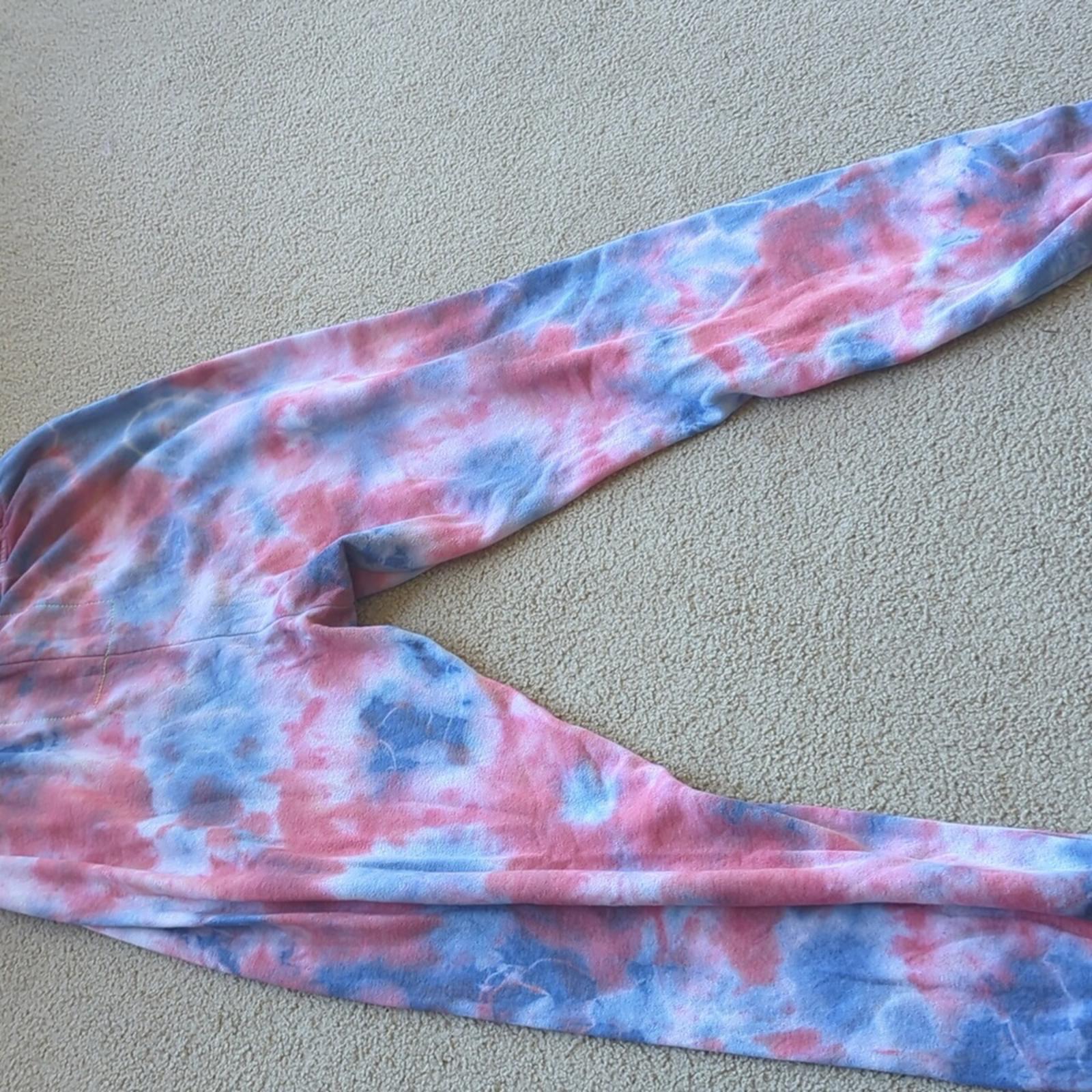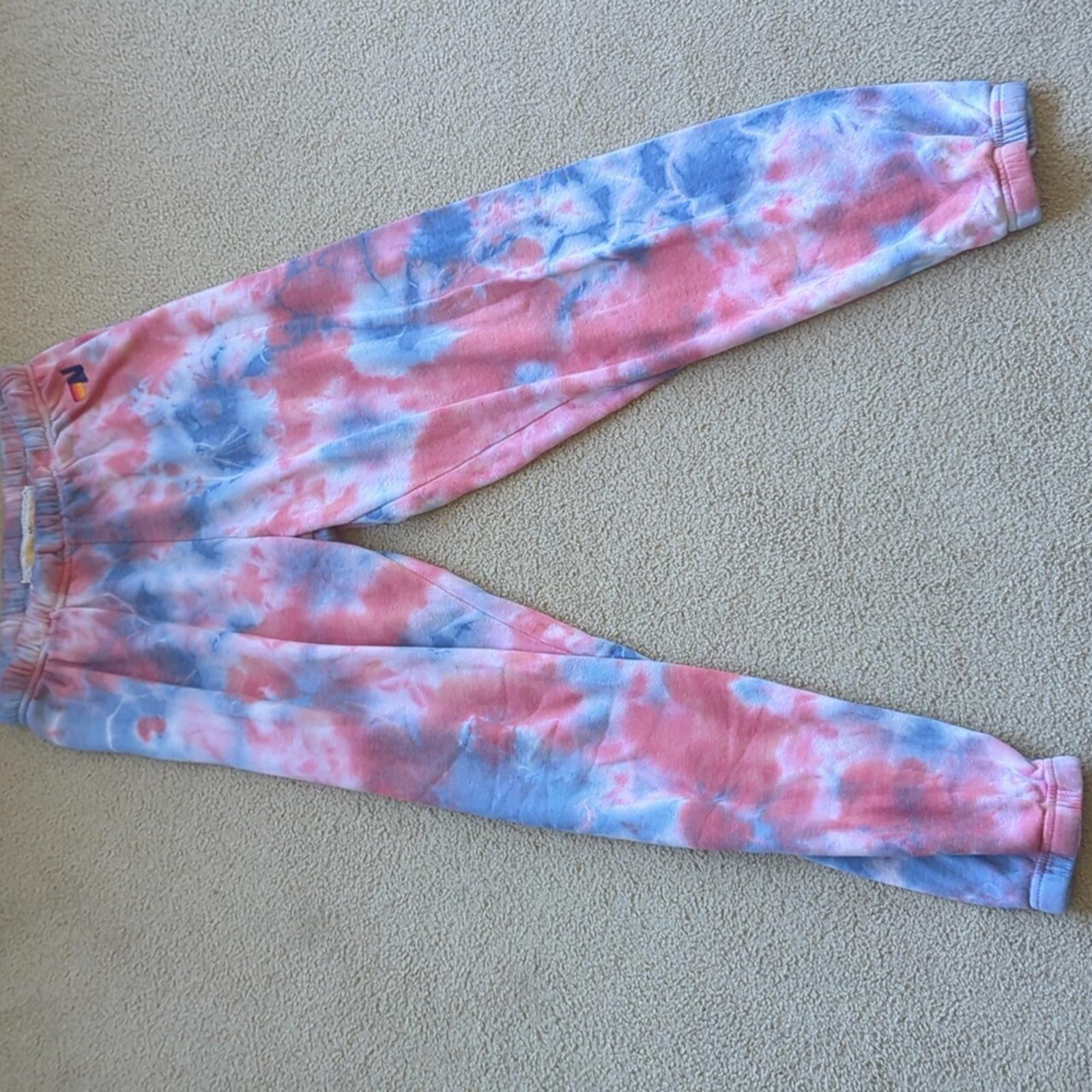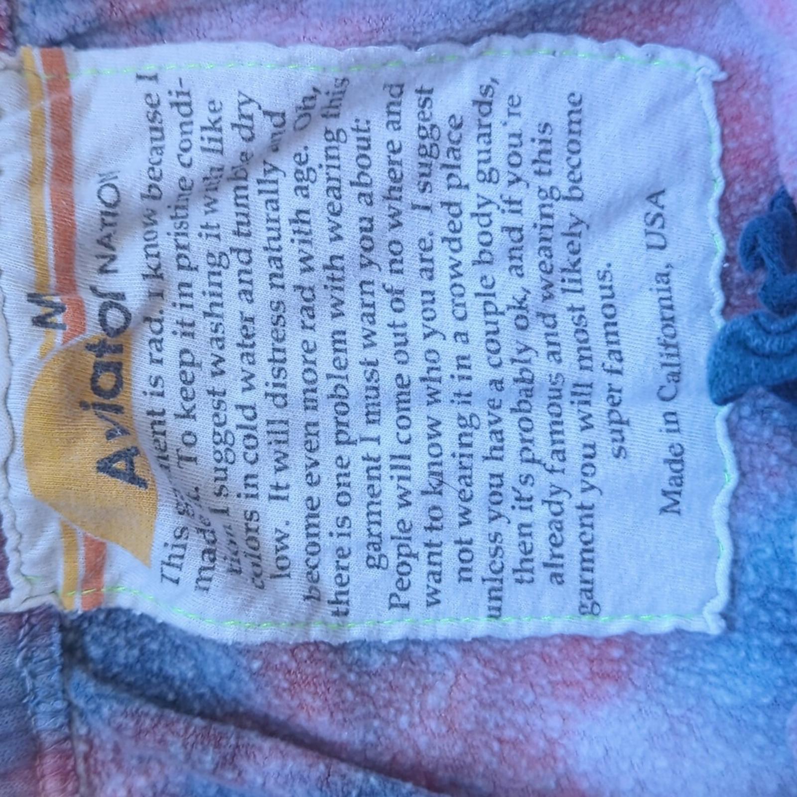 aviation light blue and red hand-dyed sweatpants. lightweight style. Size medium. jogger. elastic at waist and at ankles.