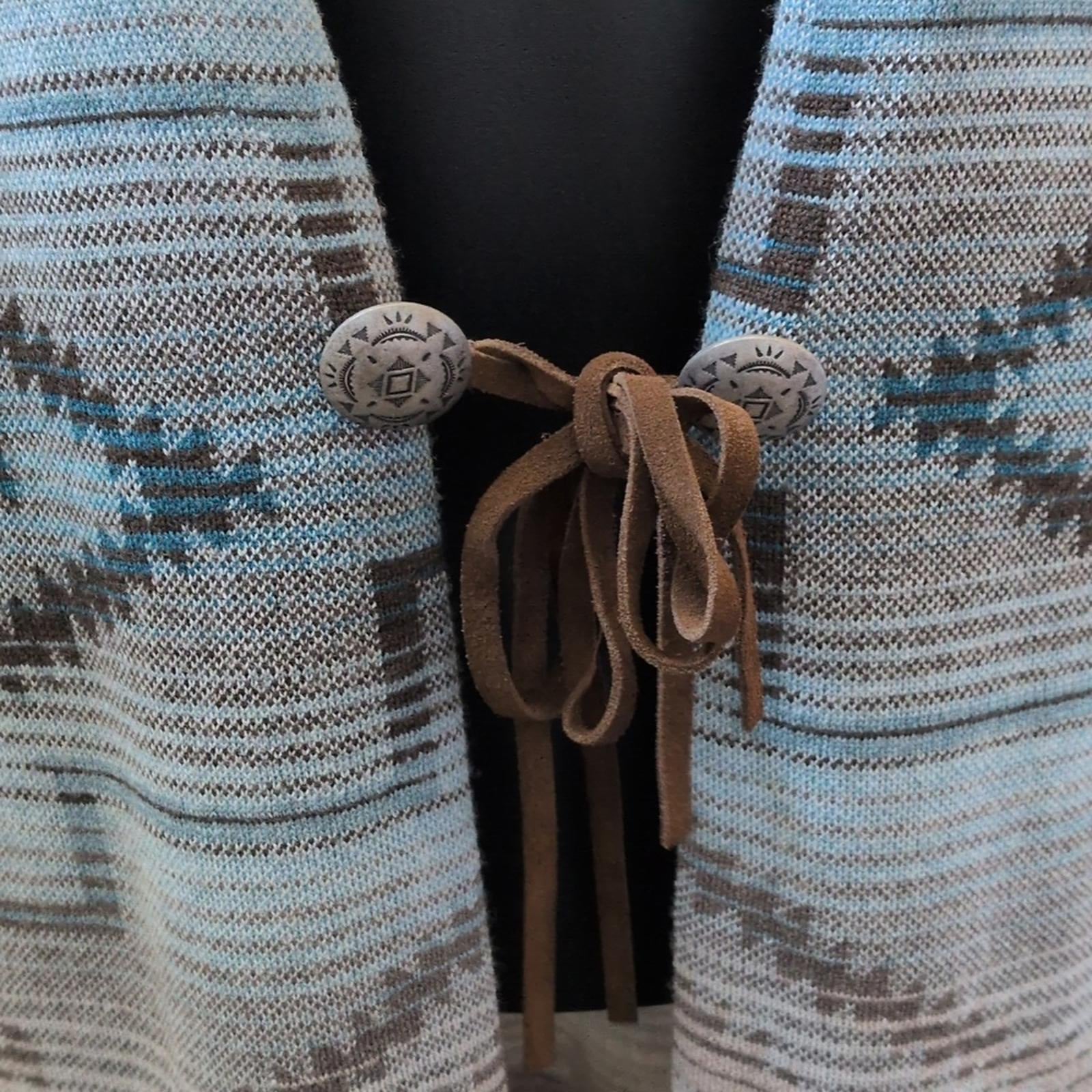 Pendleton Merino Wool Pinyon Duster.  Fits a s/m. has leather tie in front with buttons. can wear open or closed. extremely soft and beautiful. Southwestern design.